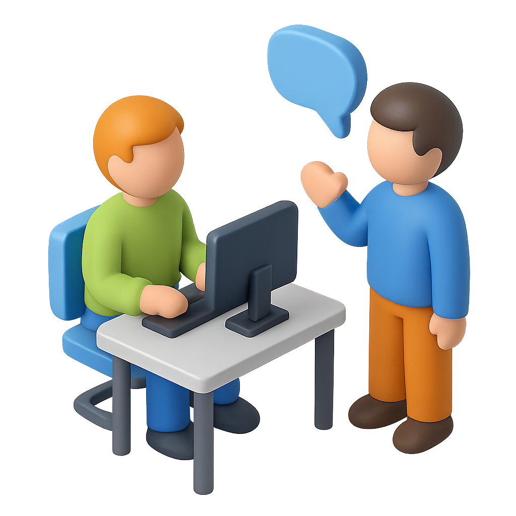 /Collection: /by davooda/Type: PNG/A vibrant 3D illustration depicting two characters engaged in conversation. One character sits at a computer, while the other stands beside them, gesturing. The design features a transparent background and an isometric view.