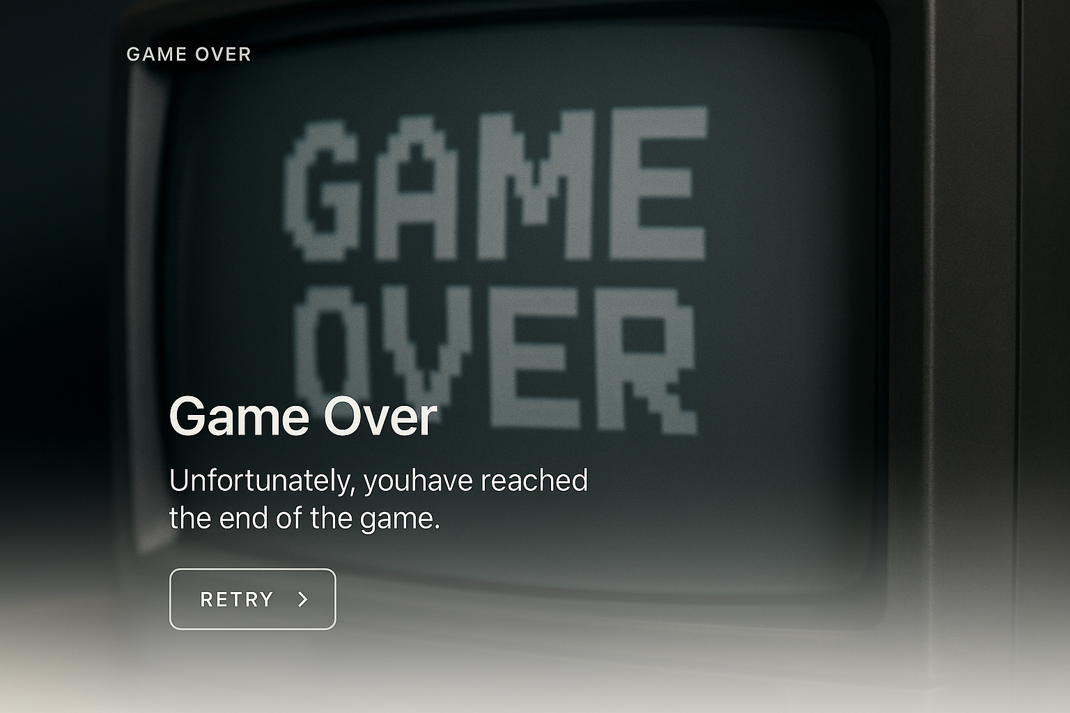 A retro-themed Game Over screen featuring pixelated text on an old monitor. Includes a retry button, conveying a sense of nostalgia with a dark gradient background.