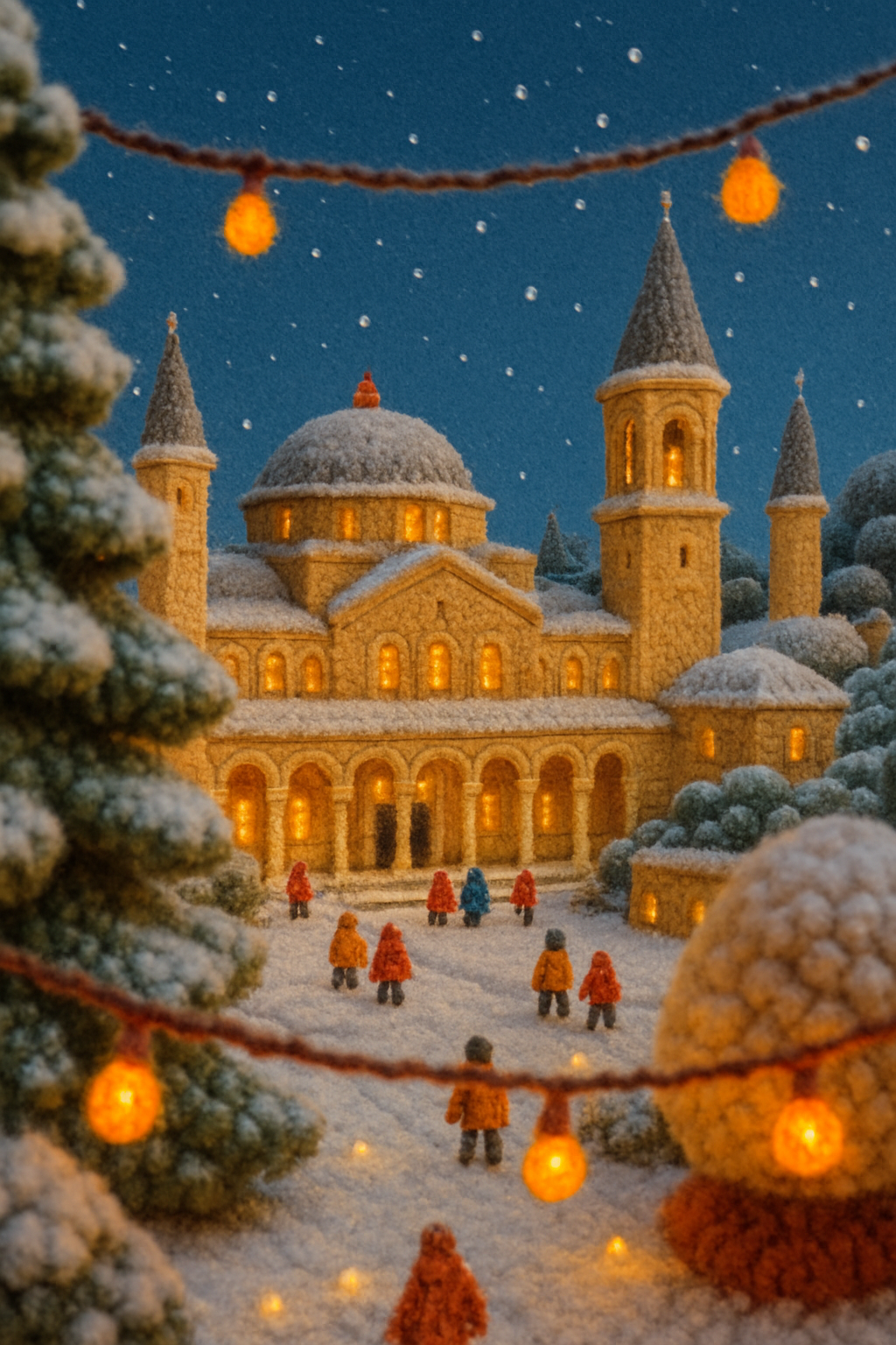 A whimsical depiction of Topkapi Palace, crafted to look like it's made of wool. The scene features a snowy atmosphere, glowing lights, and tiny figures, enhancing the festive vibe.