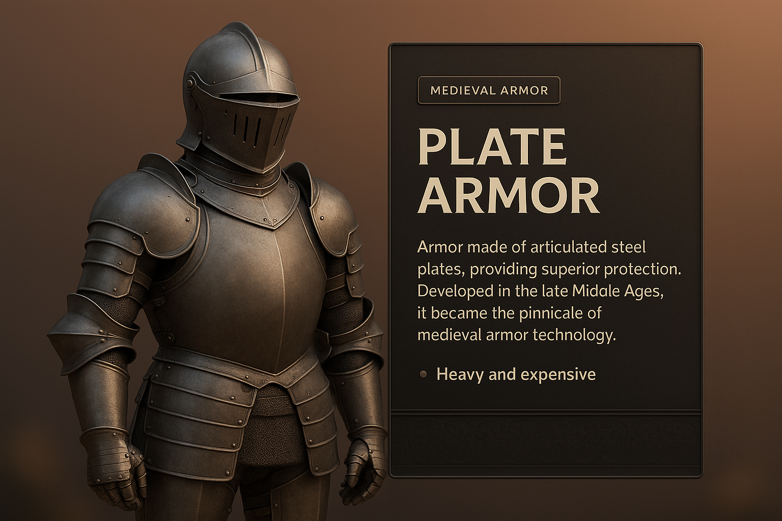 /Collection: /by davooda/Type: PNG/A striking 3D illustration of medieval plate armor, showcasing its intricate design and structure. Accompanied by a dark informational panel highlighting key features.