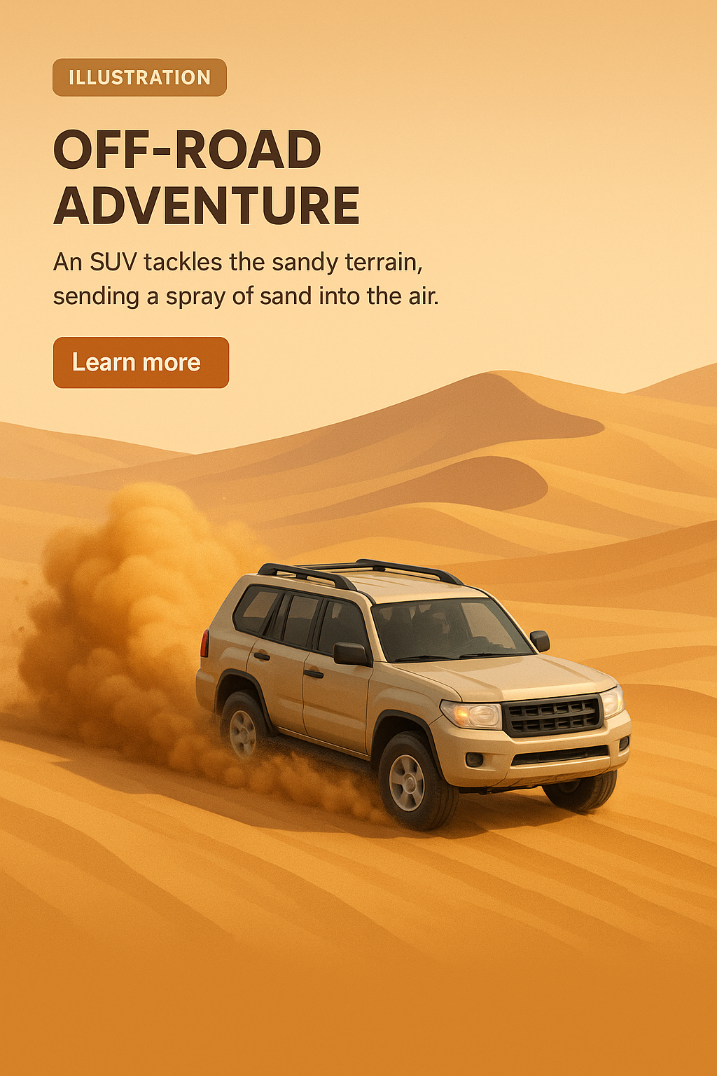 A 4x4 SUV speeds through sandy dunes in a vast desert, kicking up sand. The illustration captures the essence of off-road adventure with a smooth gradient background.
