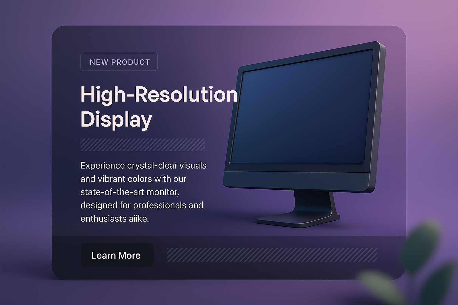 /Collection: /by davooda/Type: PNG/A sleek 3D monitor design featuring a high-resolution display, set against a smooth gradient background. The layout includes a dark overlay with product details and a call-to-action button.