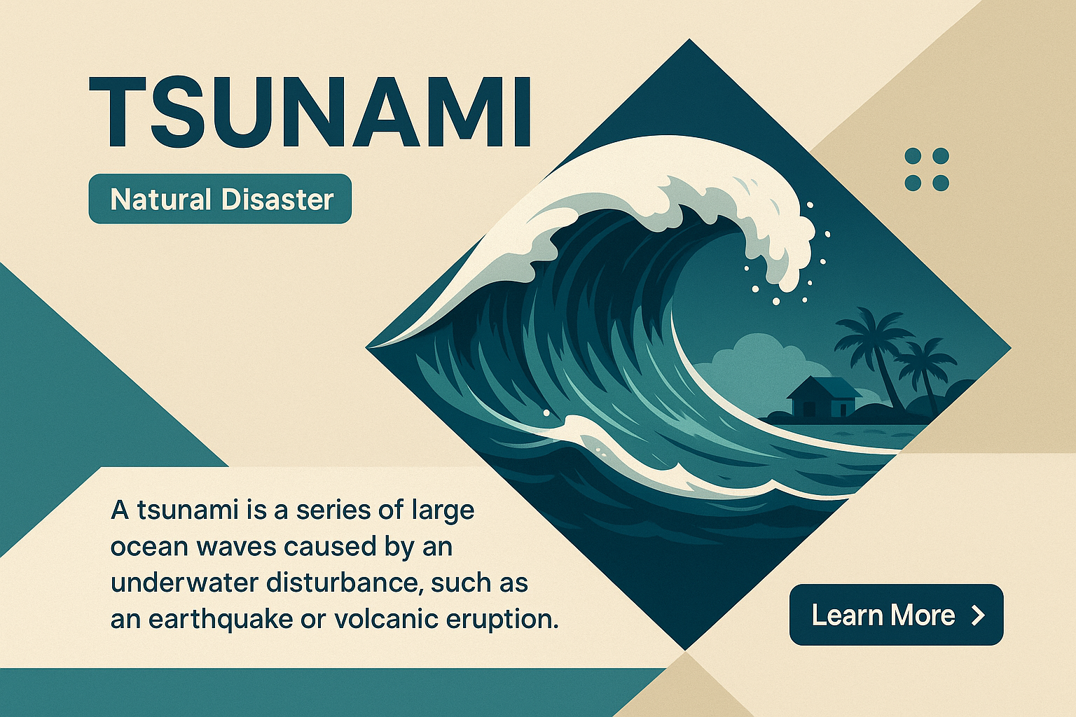 A visually striking illustration of a tsunami wave, emphasizing its power and nature. The design includes a layered composition with contrasting colors and a call-to-action button.