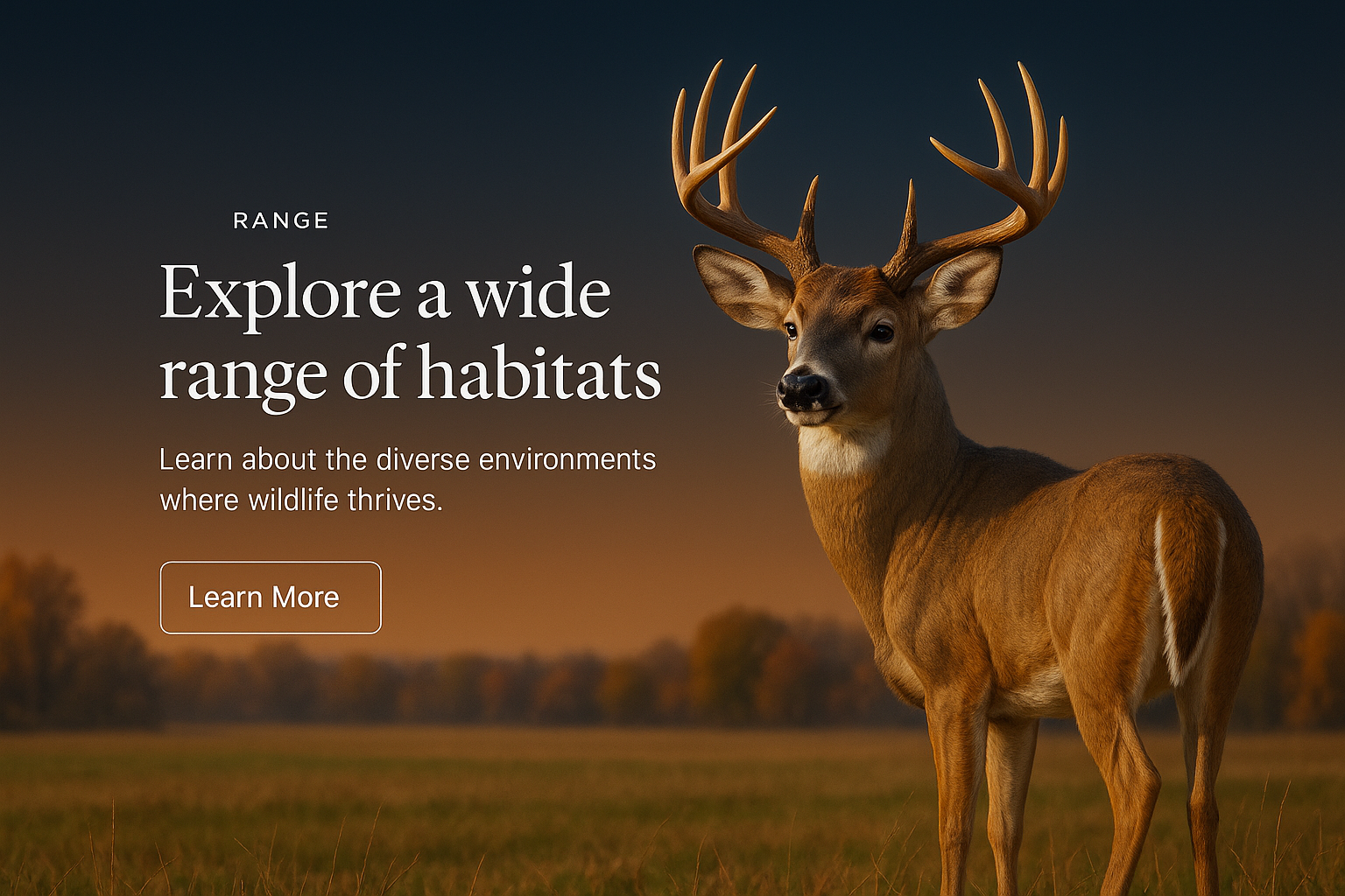 /Collection: /by davooda/Type: PNG/A stylish web page featuring a deer in a serene habitat. The design includes a gradient background, concise text, and a prominent action button inviting exploration.