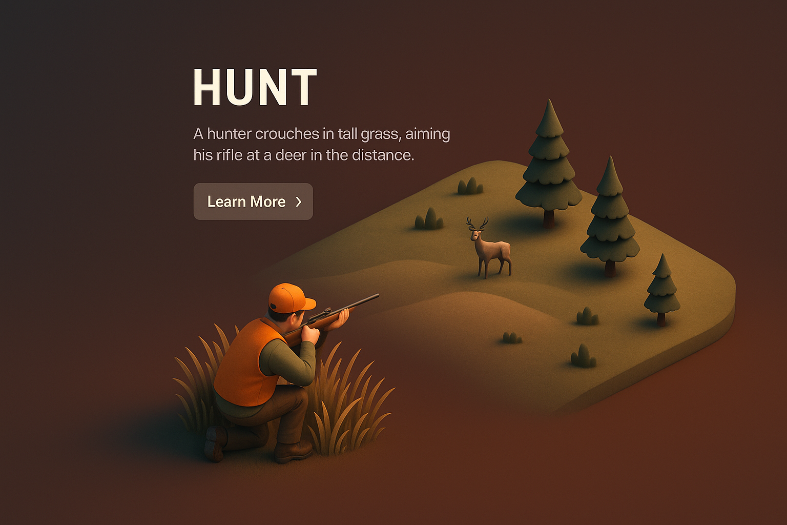 /Collection: /by davooda/Type: PNG/A detailed 3D scene of a hunter aiming at a deer in a stylized environment, showcasing a dark gradient background with a simple layout. Elements include text and a call-to-action button.