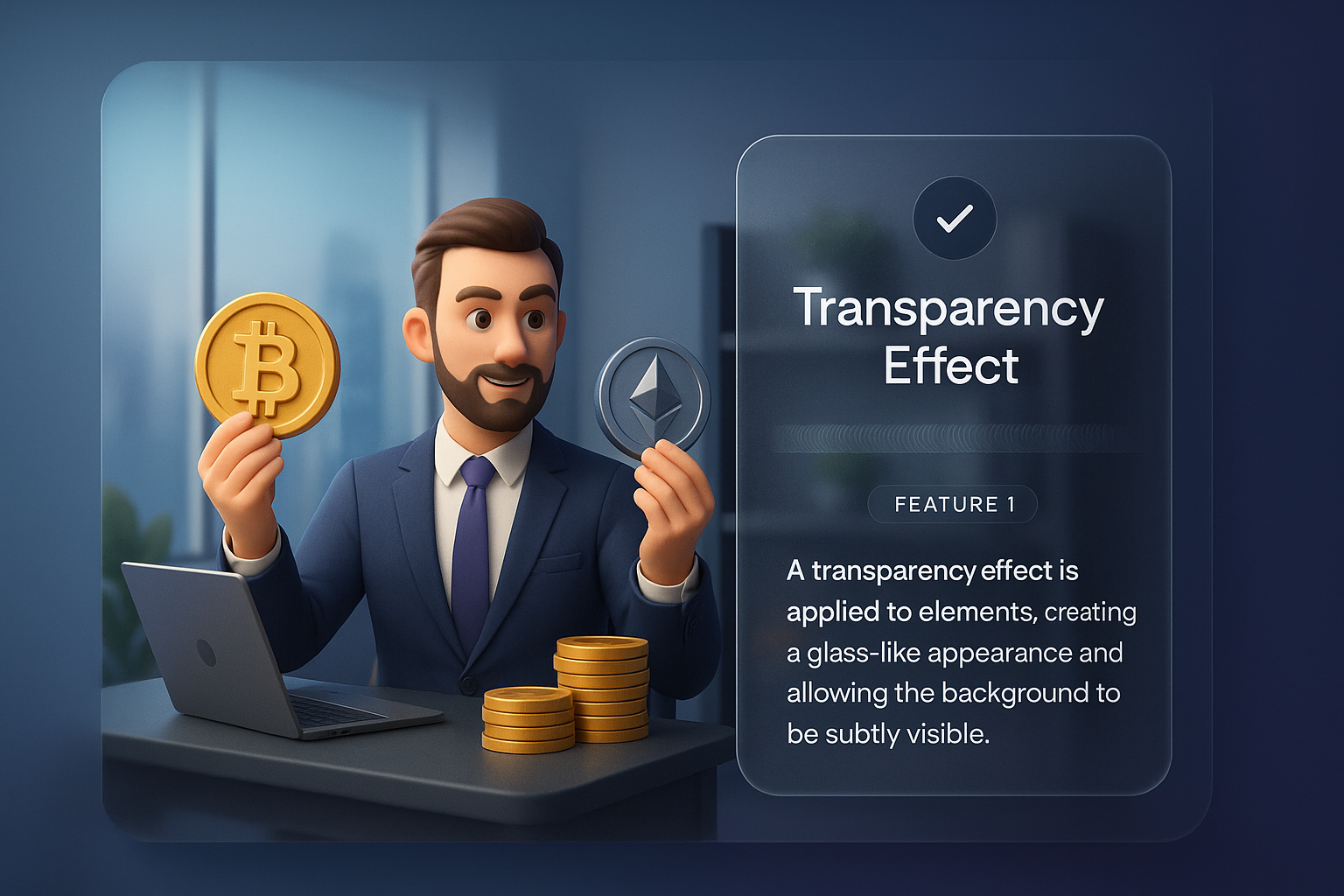 /Collection: /by davooda/Type: PNG/A professional businessman in a sleek office holding Bitcoin and Ethereum coins, with a transparent feature block displaying details. The background features a smooth gradient.