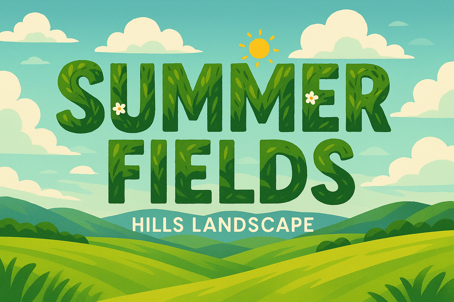 A colorful and playful illustration of rolling hills under a sunny sky, designed for seasonal promotions or nature-themed graphics. Ideal for summer events or outdoor activities.