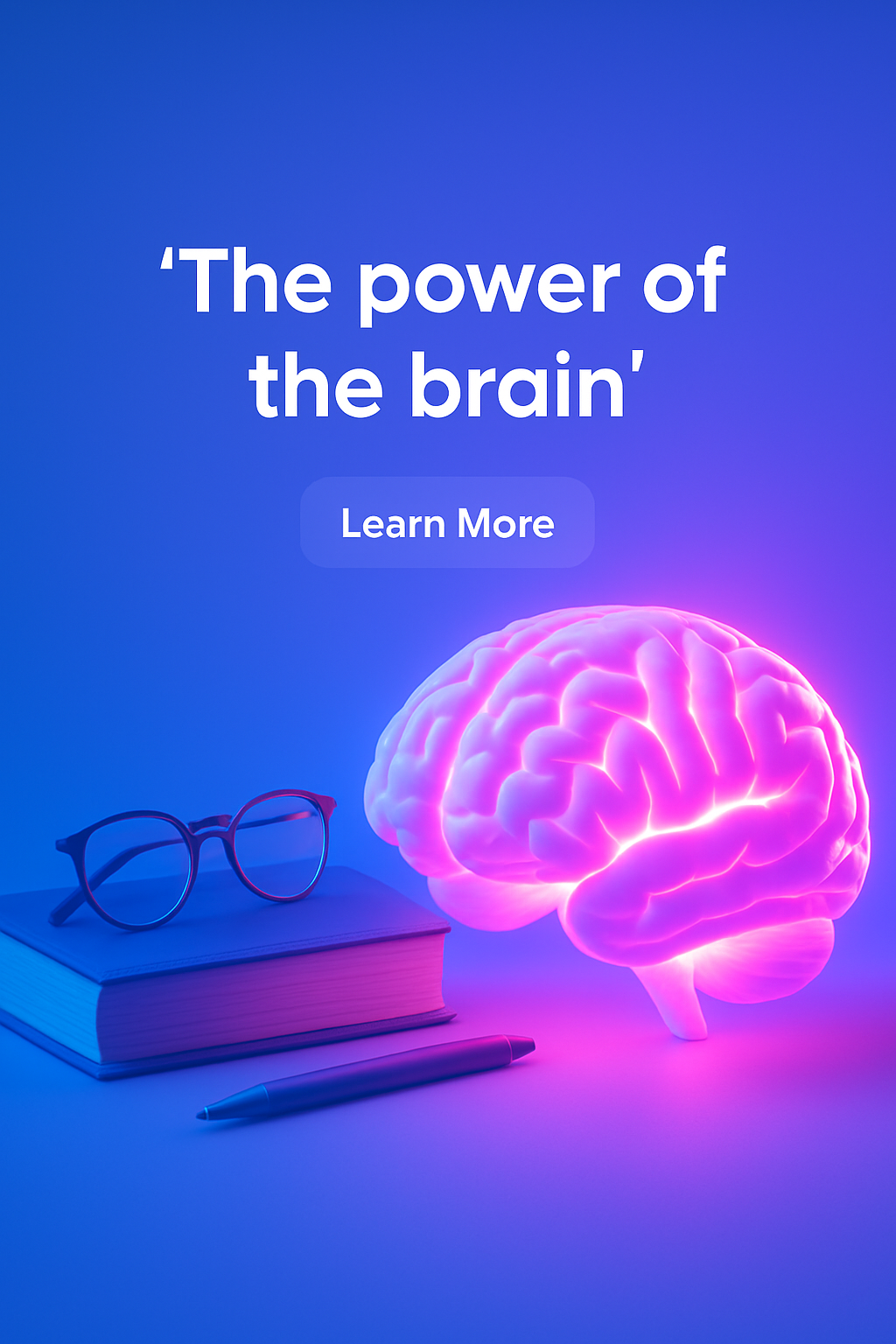 A glowing neon pink brain emits vibrant light against a solid blue background, accompanied by glasses and a book, enhancing the scene's atmosphere.