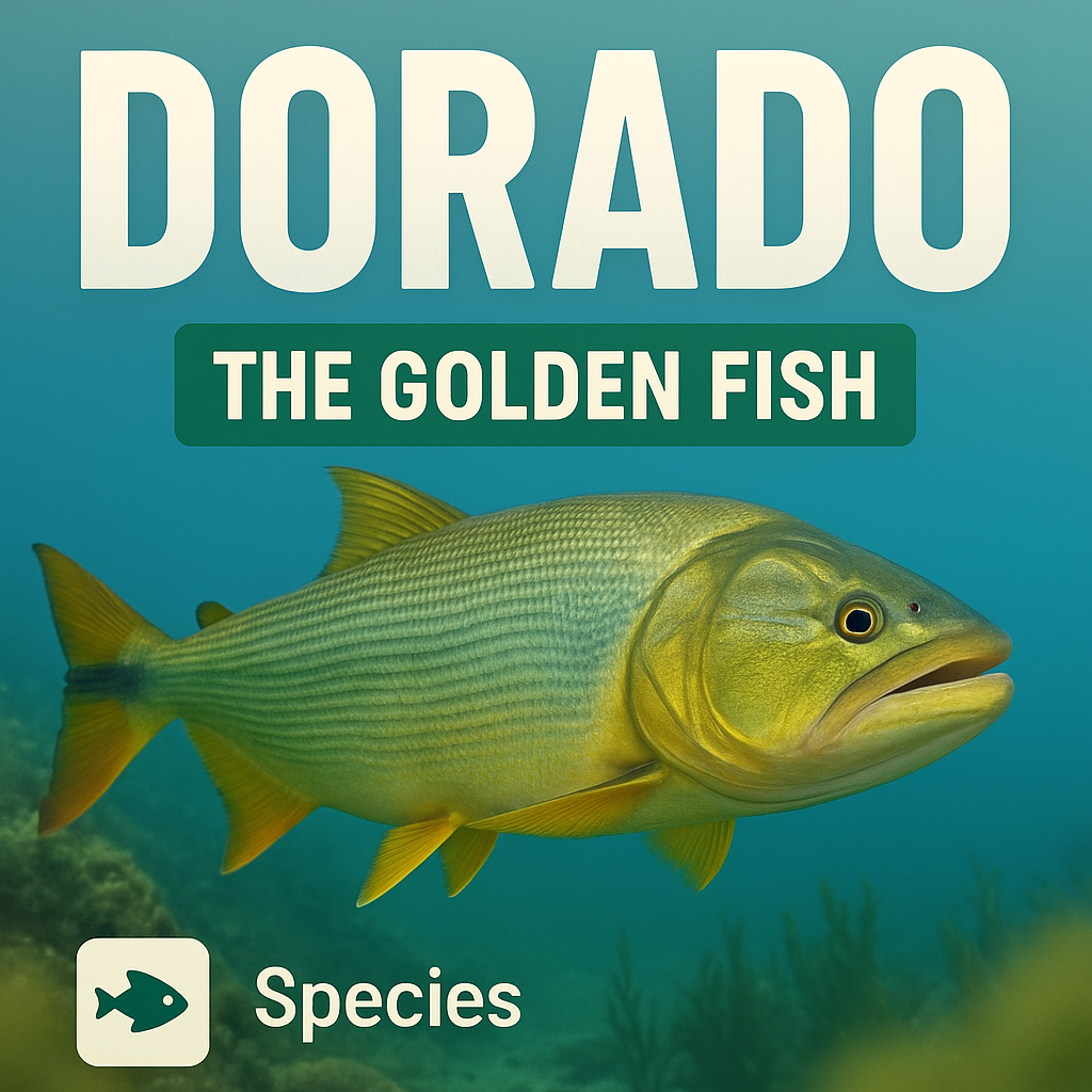 /Collection: /by davooda/Type: PNG/A visually appealing YouTube thumbnail featuring a realistic depiction of a Dorado fish. The design includes a gradient background, clear headline text, and a focus on the species.