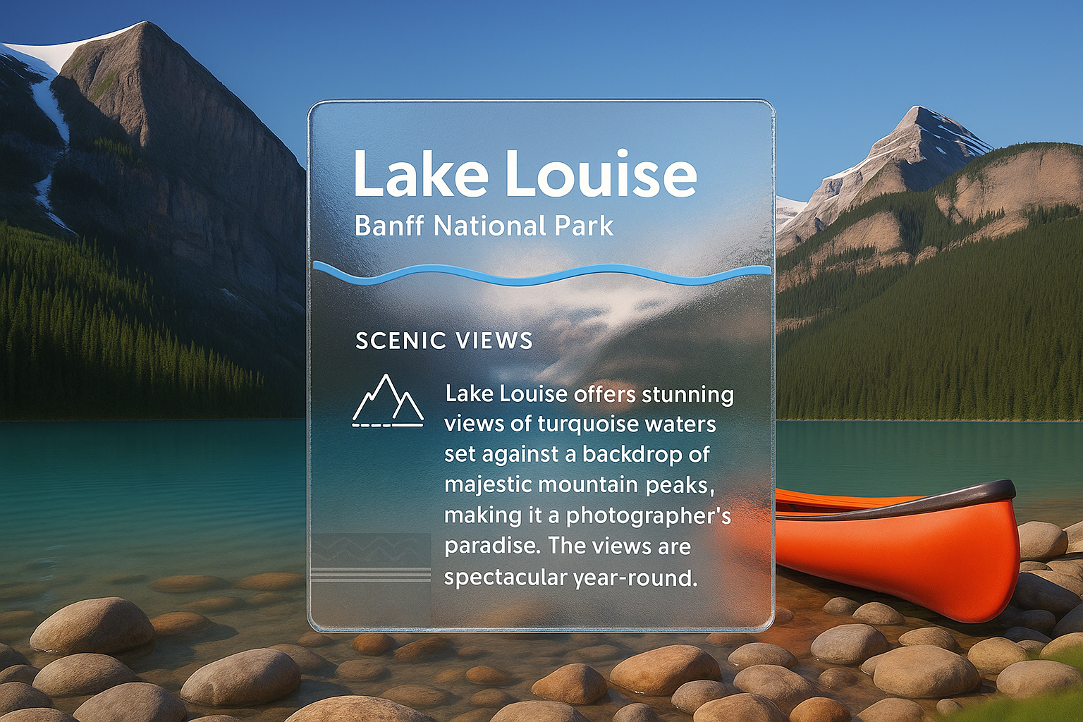 /Collection: /by davooda/Type: PNG/A breathtaking 3D illustration of Lake Louise featuring turquoise waters surrounded by majestic mountains, complemented by a stylish information block with scenic views.