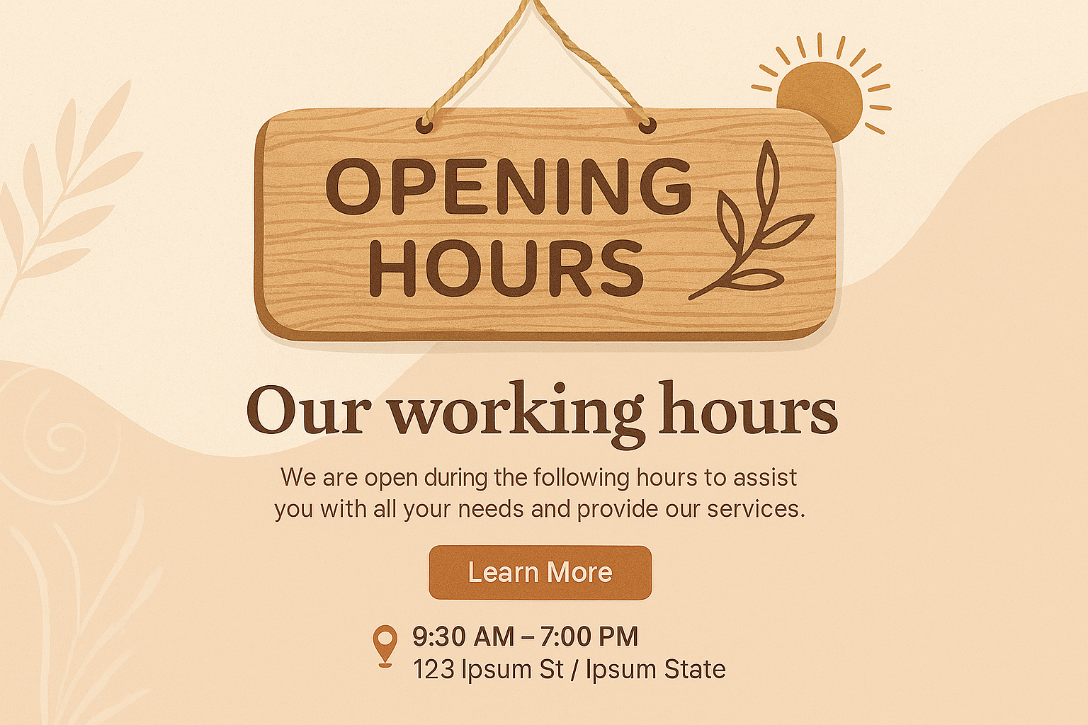 A visually appealing board displaying opening hours in a boho style. It features a wooden sign with clear text, a sun illustration, and soft background colors.