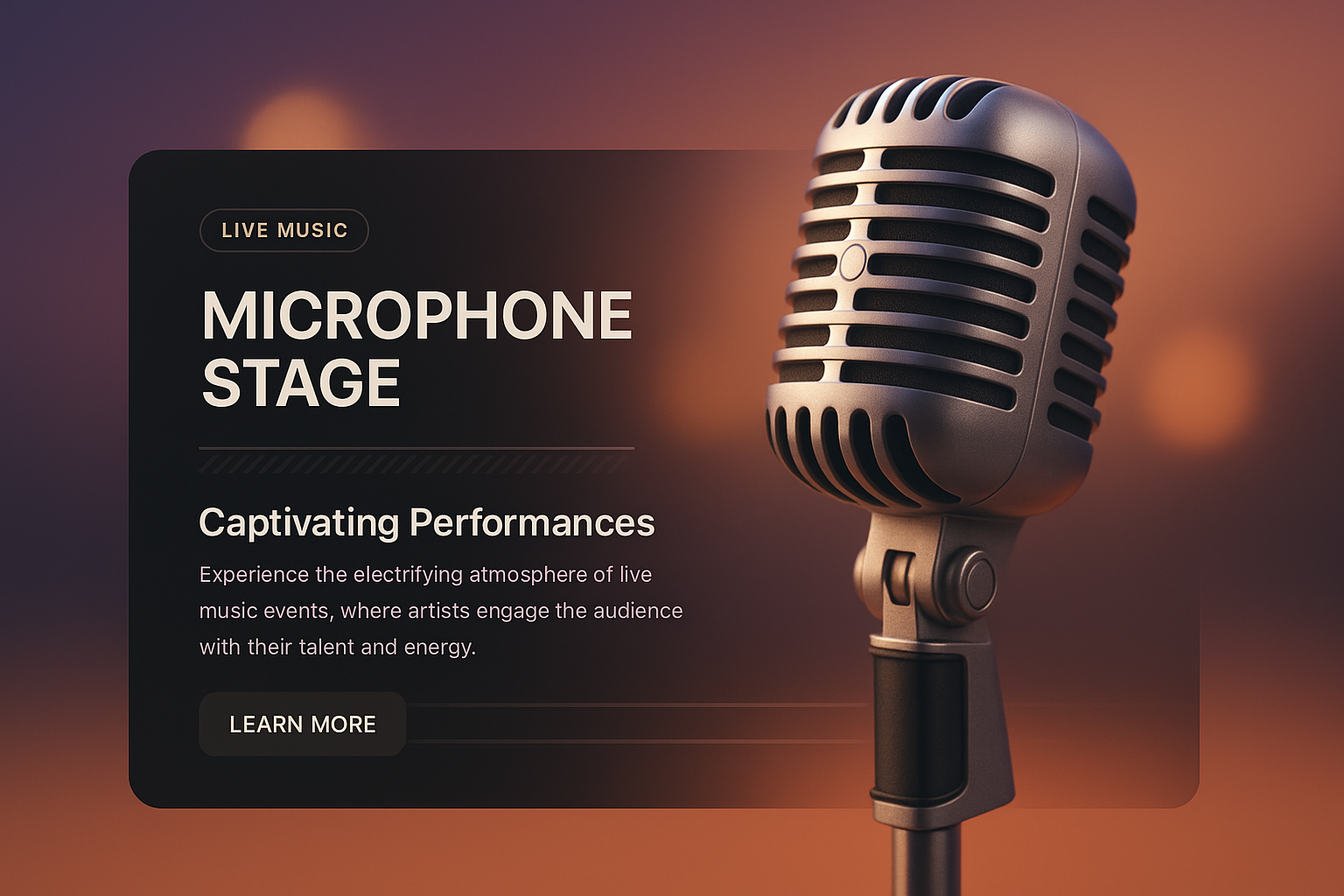/Collection: /by davooda/Type: PNG/A visually striking 3D illustration featuring a microphone on stage, with a dark overlay containing engaging text and graphics about live music performances.