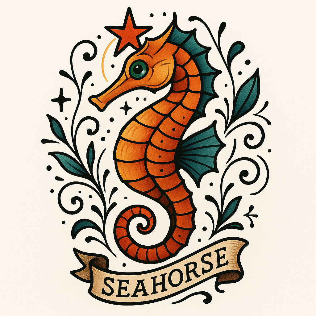 A vibrant seahorse illustration surrounded by decorative floral motifs and a banner, ideal for art prints or marine-themed projects.