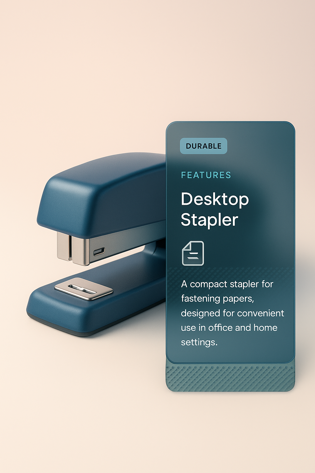 A modern 3D illustration of a desktop stapler against a smooth gradient background. The design includes a feature card highlighting its durability and compact size for office use.