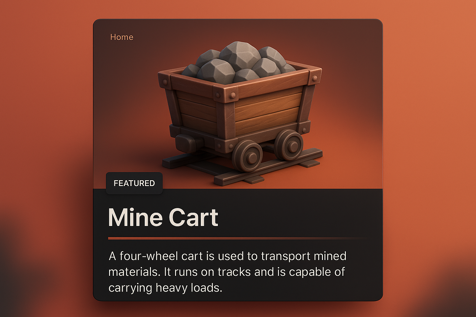 A 3D illustration of a wooden mine cart filled with rocks, set against a gradient background. The design includes integrated web elements, featuring a dark panel with descriptive text and a featured label.