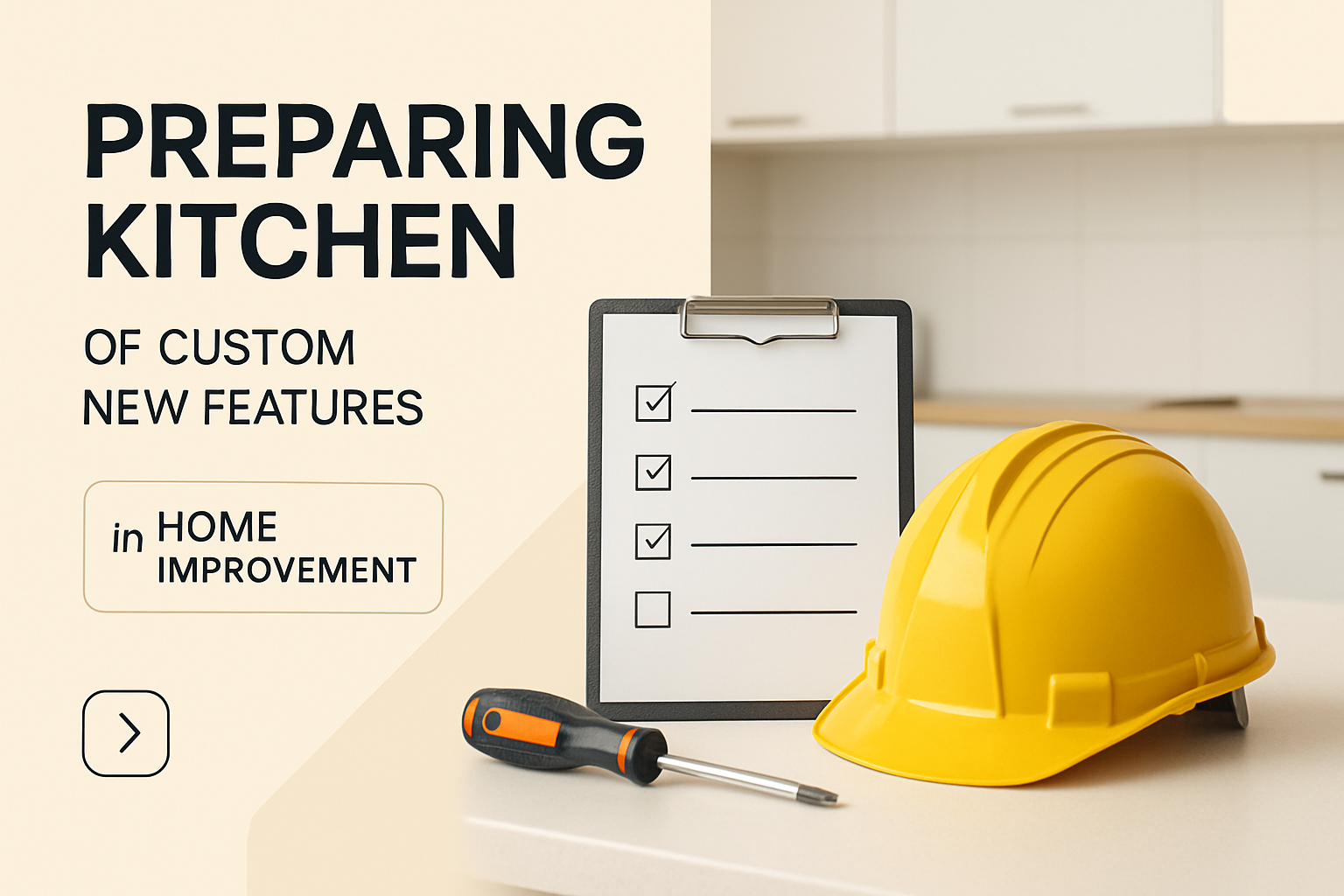 A modern kitchen setup featuring a yellow hard hat, a clipboard with checkboxes, and a screwdriver. The design is clean and professional, emphasizing clarity.