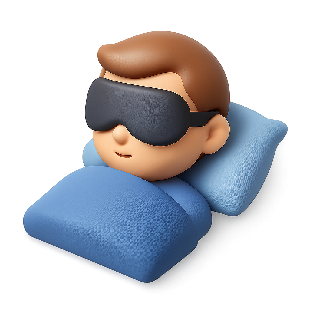 A 3D representation of a person sleeping comfortably with a sleep mask on. The character is depicted in a three-quarter view, showcasing a cozy pillow and a serene expression.