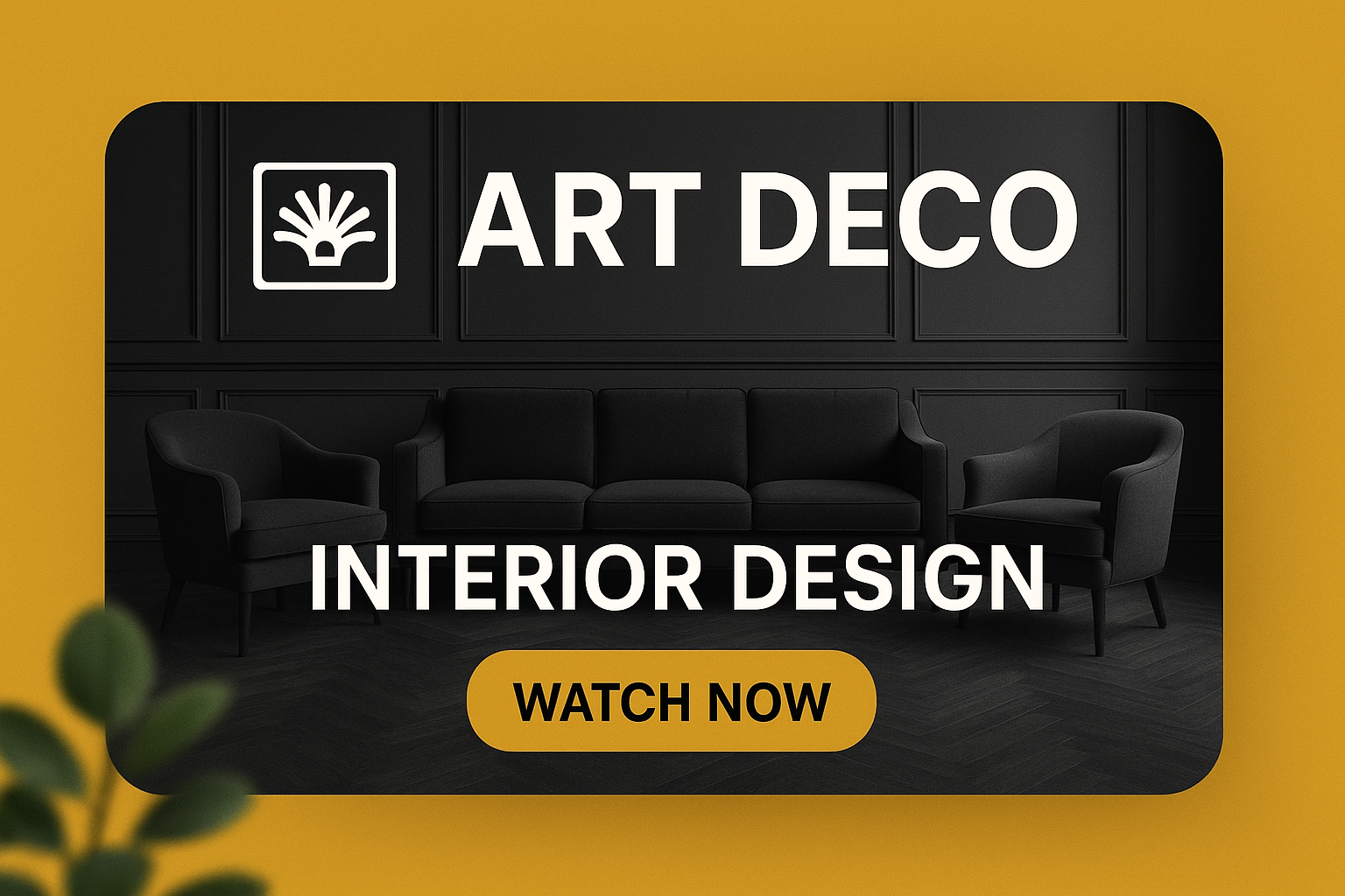Stylish promotional banner featuring a modern Art Deco interior design theme. Ideal for social media posts or video content related to home decor.