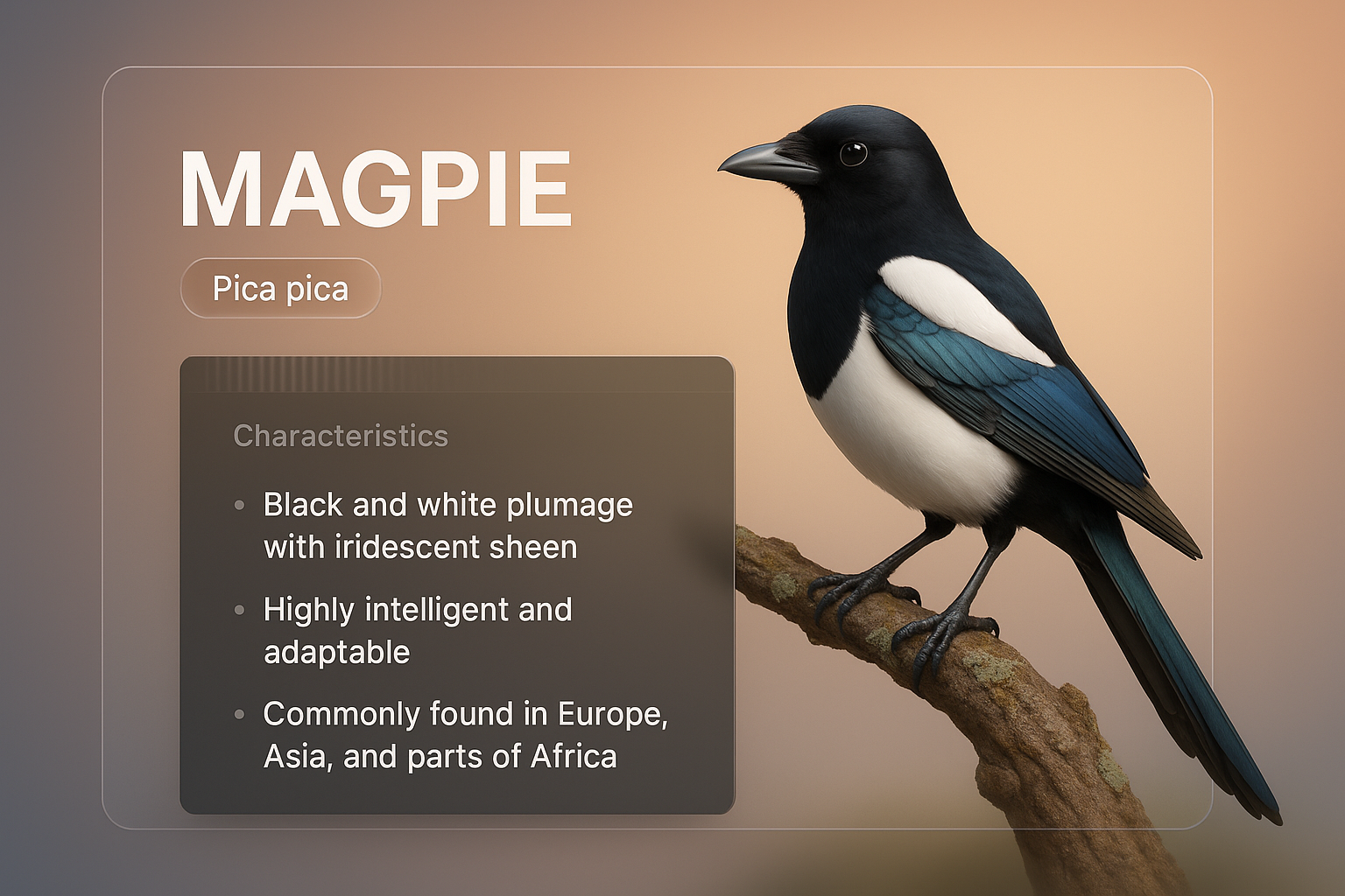 /Collection: /by davooda/Type: PNG/A detailed 3D rendering of a magpie perched on a branch, featuring a translucent text overlay with characteristics about the bird. The background has a smooth gradient, enhancing the visual appeal.