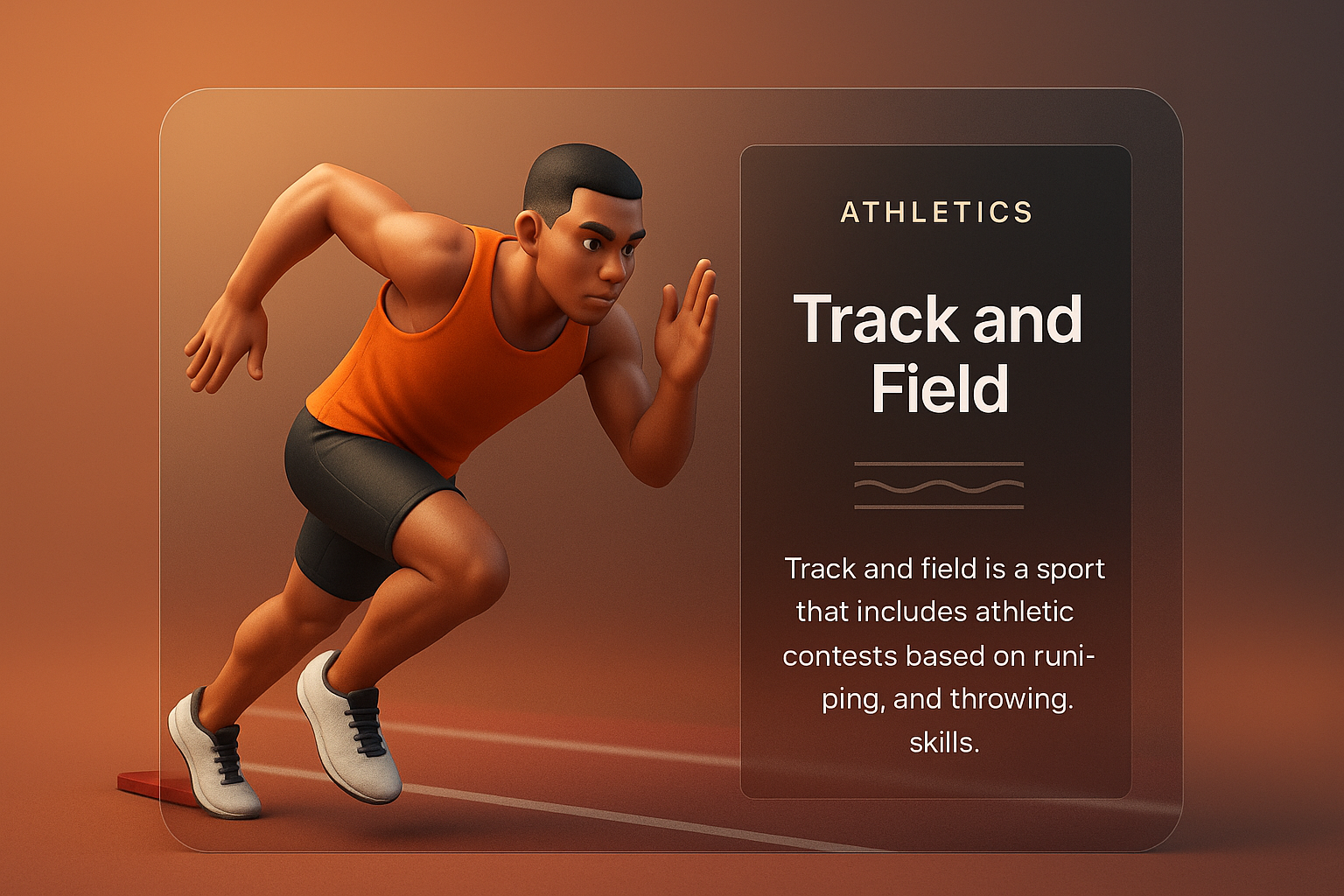 A vibrant 3D illustration of an athletic runner in motion. The design features a gradient background and a transparent overlay with text details about track and field.