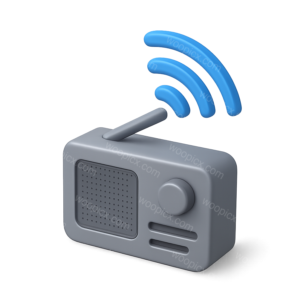 A sleek 3D icon depicting a radio with wireless signal waves emanating from it. The design features a transparent background, showcasing a three-quarter view for a volumetric effect.