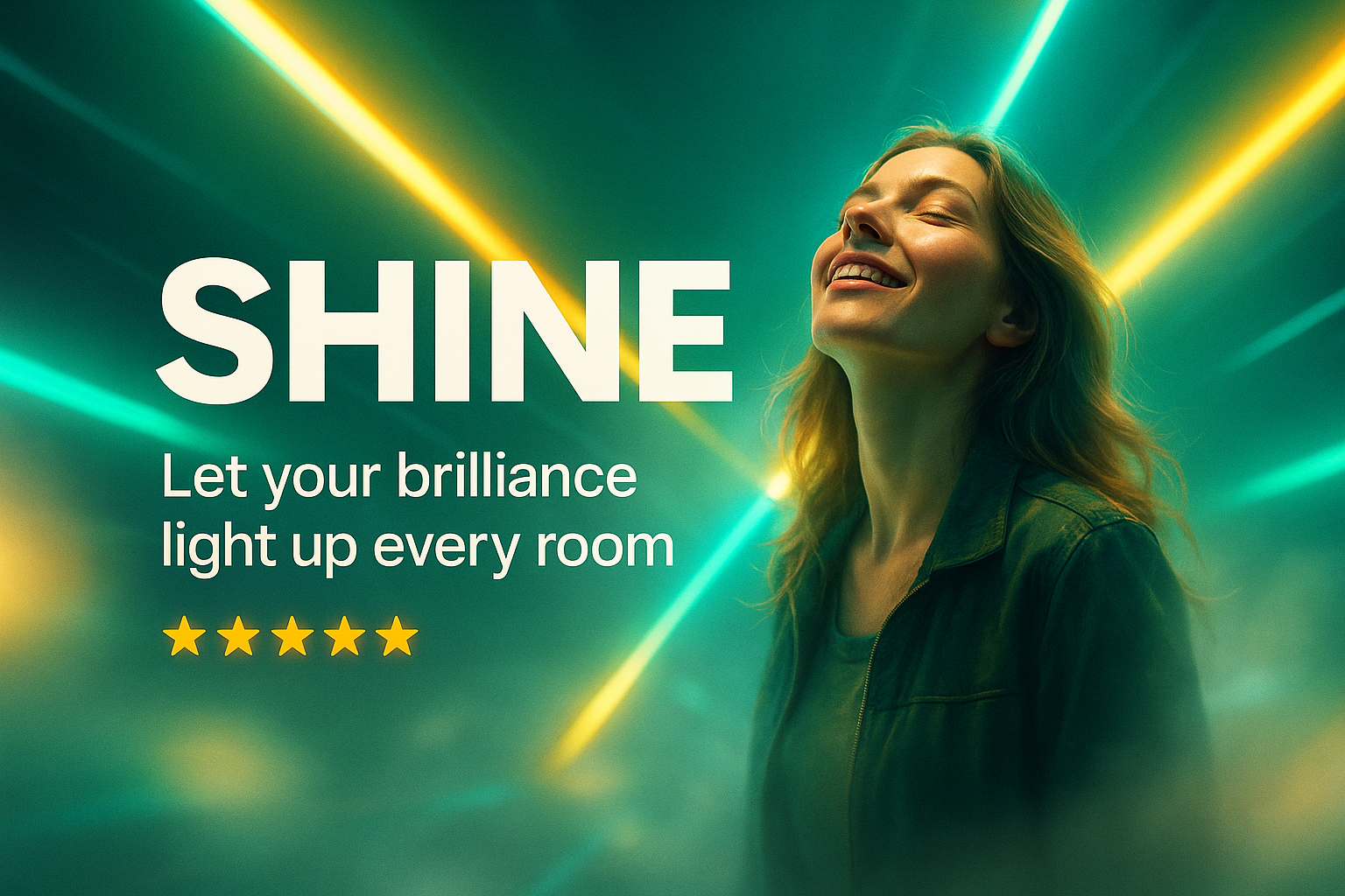A vibrant carousel slide featuring a woman illuminated by neon lights, with a bold headline 'SHINE' and a subtitle promoting brilliance. The scene exudes depth and professional aesthetics.