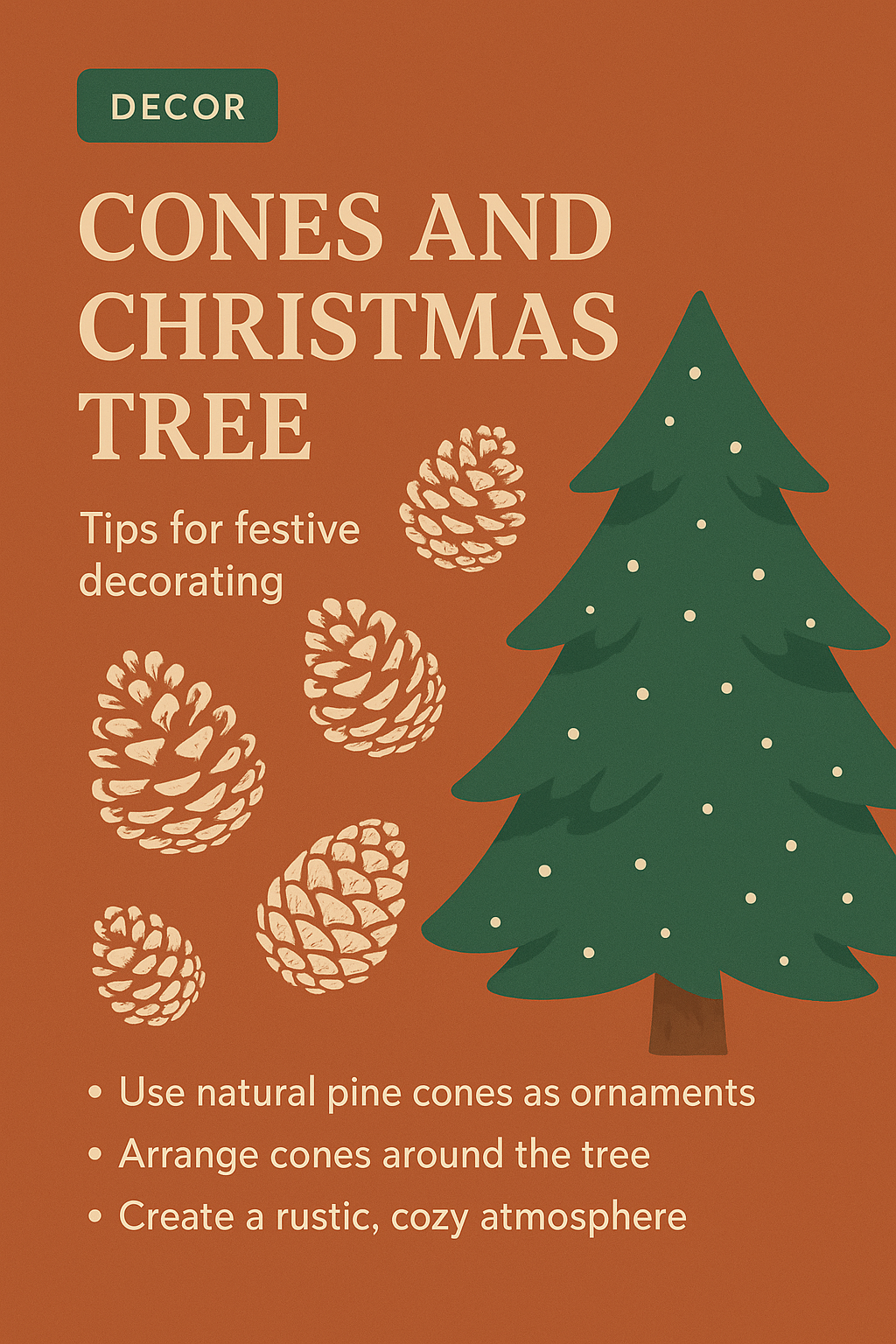 /Collection: /by davooda/Type: PNG/Informative graphic offering decorating tips for Christmas using pine cones and a tree, designed in a cozy, rustic style suitable for seasonal content.