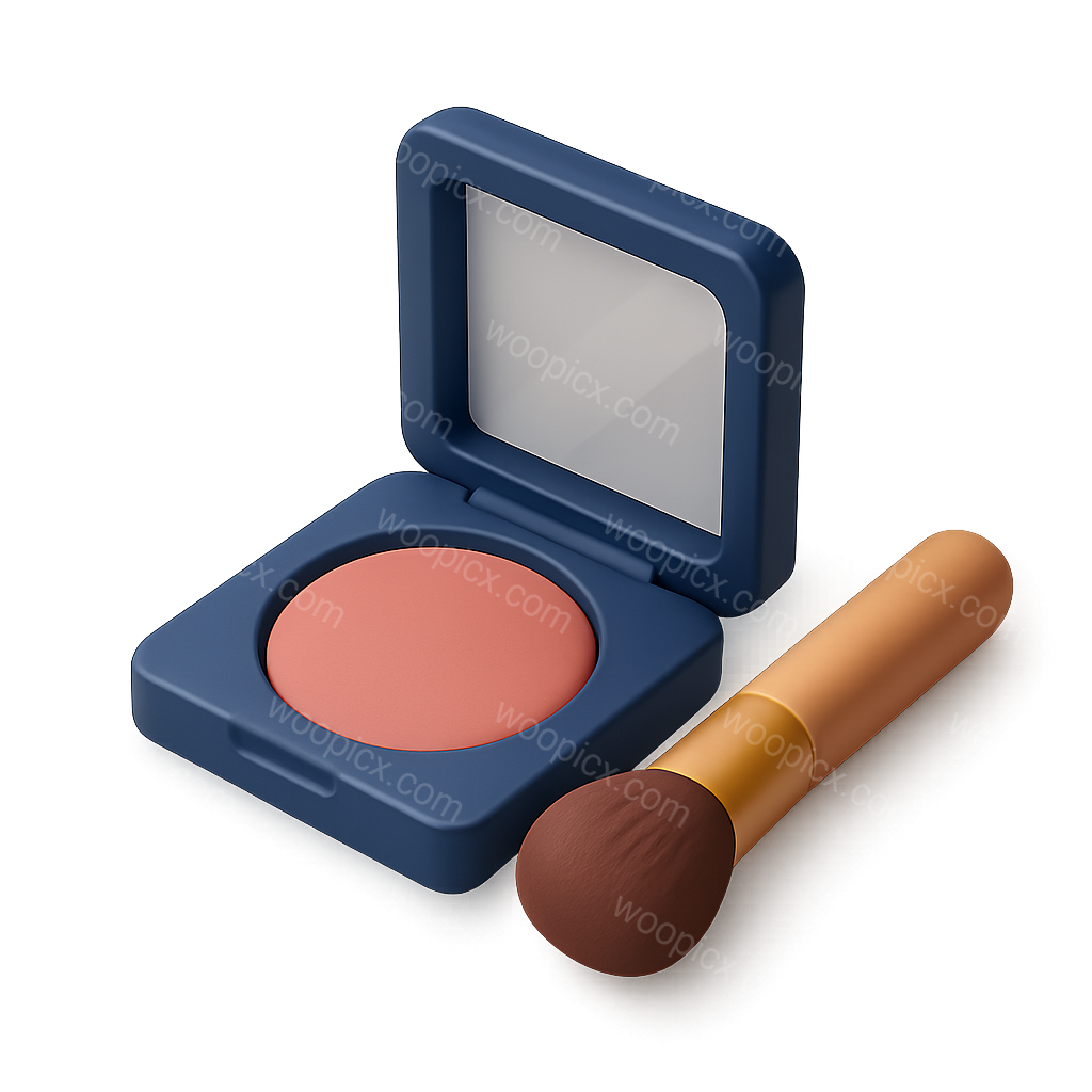 A visually appealing 3D icon of blush powder in a compact case, accompanied by a makeup brush. The design features a three-quarter view and a transparent background.