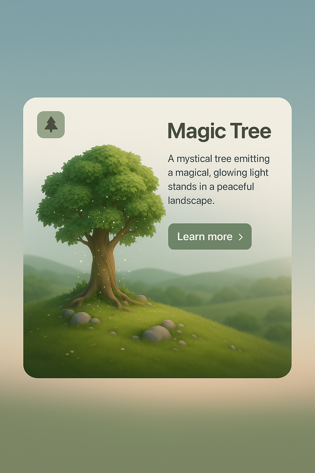 A serene 3D scene featuring a magical tree emitting glowing light, surrounded by a peaceful landscape with gentle hills and rocks.