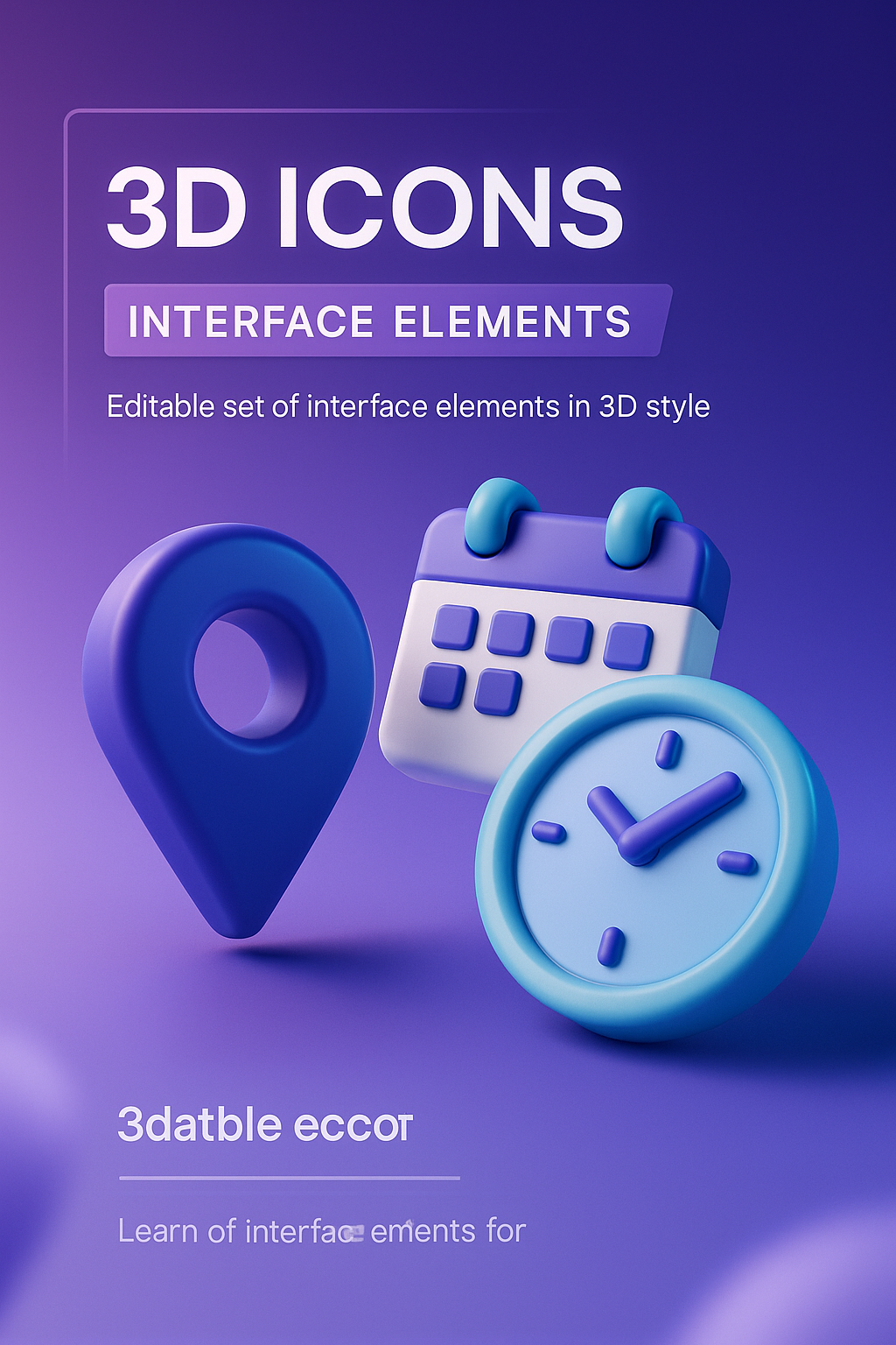 A visually appealing set of 3D icons representing location, calendar, and clock elements. The icons are designed with a smooth gradient background and a modern aesthetic.