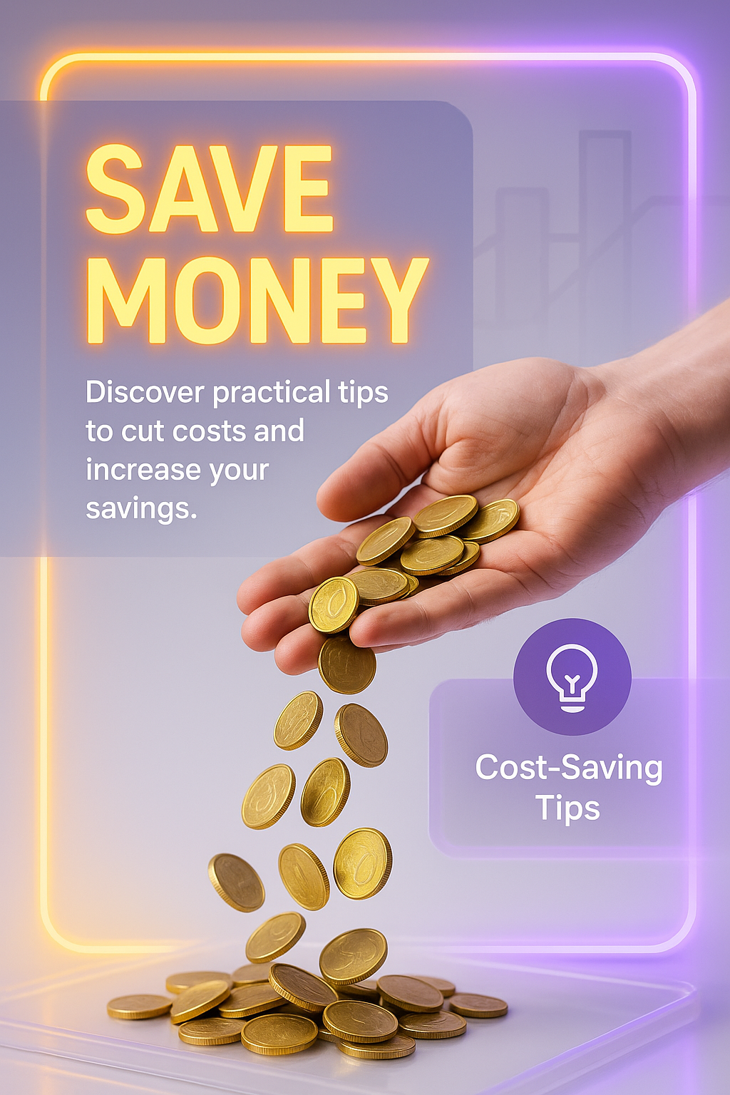 Vibrant promotional graphic featuring a hand pouring coins, highlighting practical money-saving tips. Ideal for financial advice content or budgeting resources.