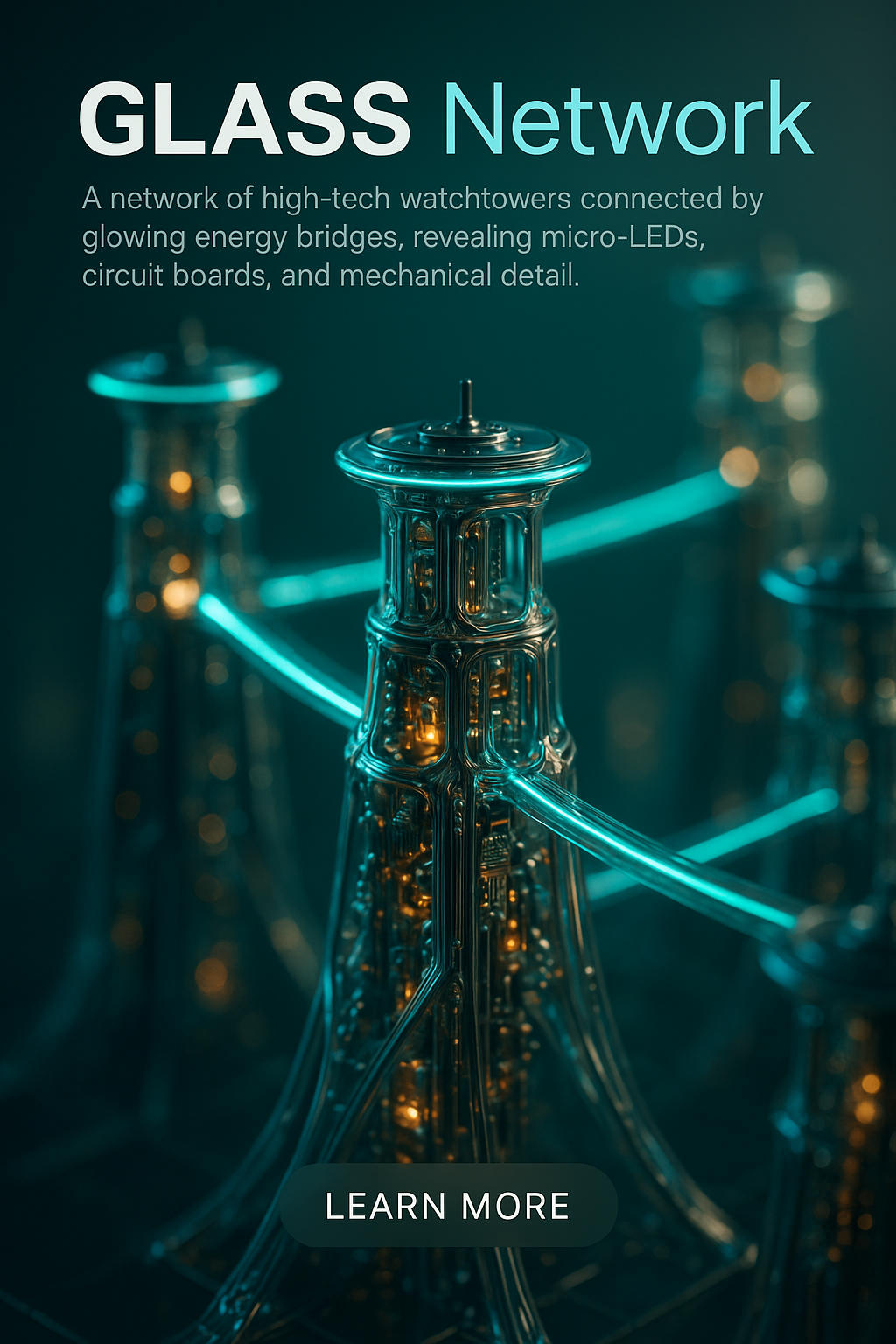 /Collection: /by davooda/Type: PNG/A stunning hyperrealistic depiction of interconnected glass watchtowers illuminated by glowing energy bridges, showcasing intricate internal details like micro-LEDs and circuit boards.