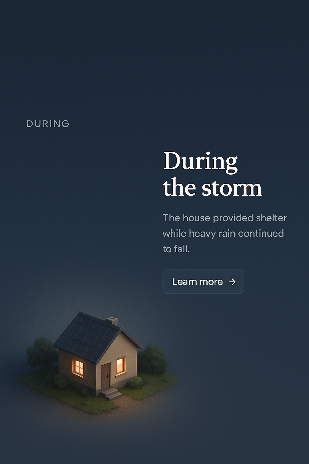 A zoomed-out view of a small house nestled in a dark, stormy environment. The background features a smooth gradient, enhancing the cozy glow from the house's windows. Text elements are clear and legible.
