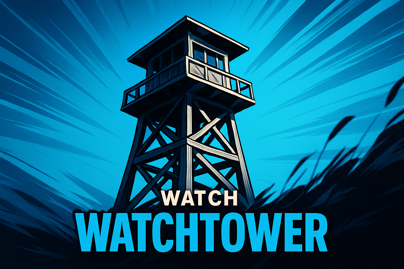 A stylized illustration of a watchtower set against a vibrant blue background. The design features dynamic lines radiating from the tower, enhancing its presence. Bold text highlights the title.