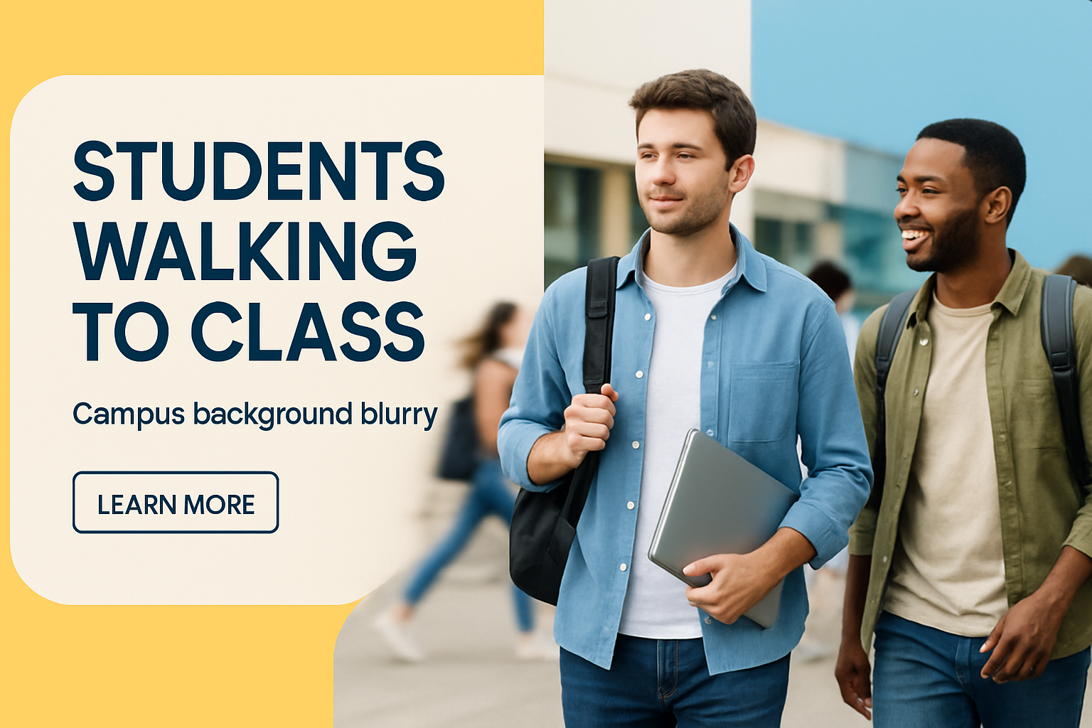 The image showcases two students walking to class in a university setting. The background is a motion-blurred campus scene, emphasizing the lively atmosphere of campus life.