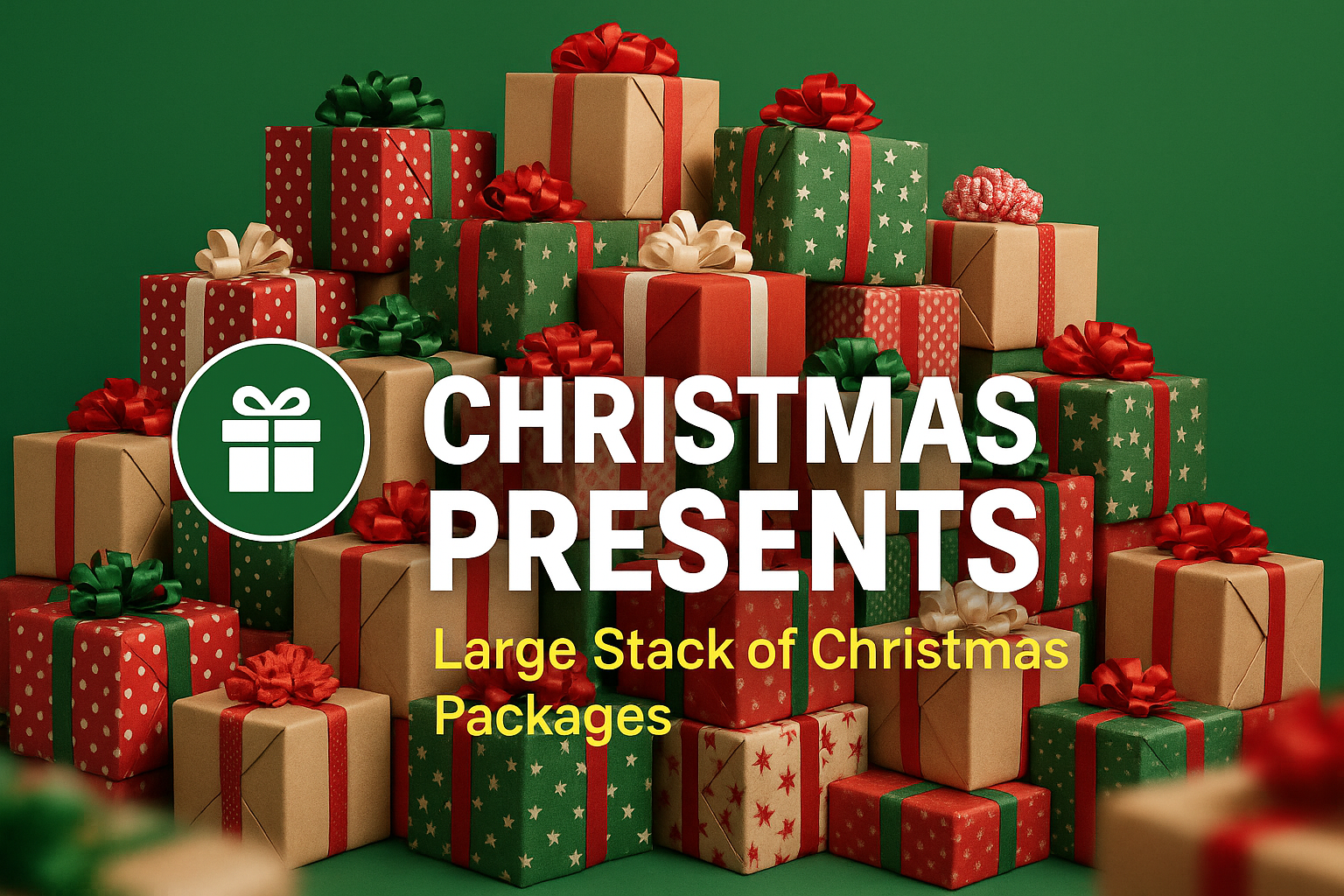 Vibrant holiday-themed image featuring a large stack of beautifully wrapped Christmas presents, perfect for seasonal marketing and festive promotions.