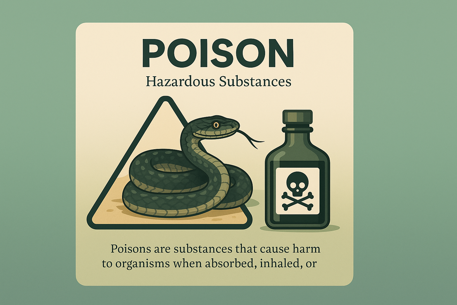A visually engaging illustration depicting poison hazards. Features a snake, a warning symbol, and a poison bottle. The design employs a three-color scheme with clear text hierarchy.