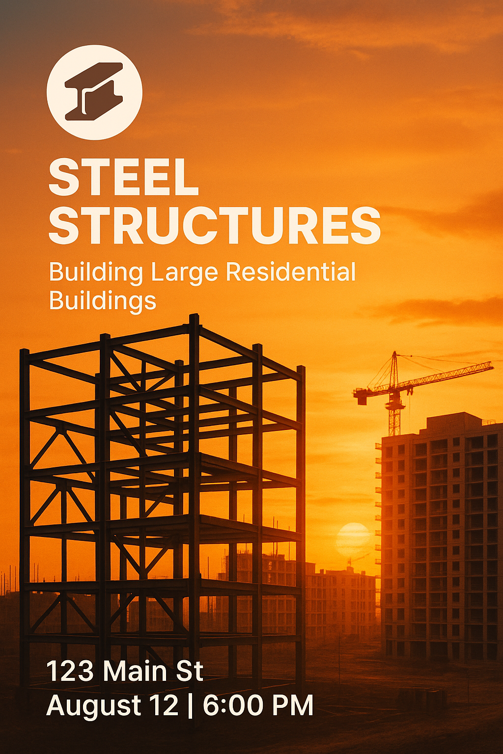 Vibrant event poster showcasing steel structure construction against a sunset backdrop, designed for promoting a workshop on residential building techniques.