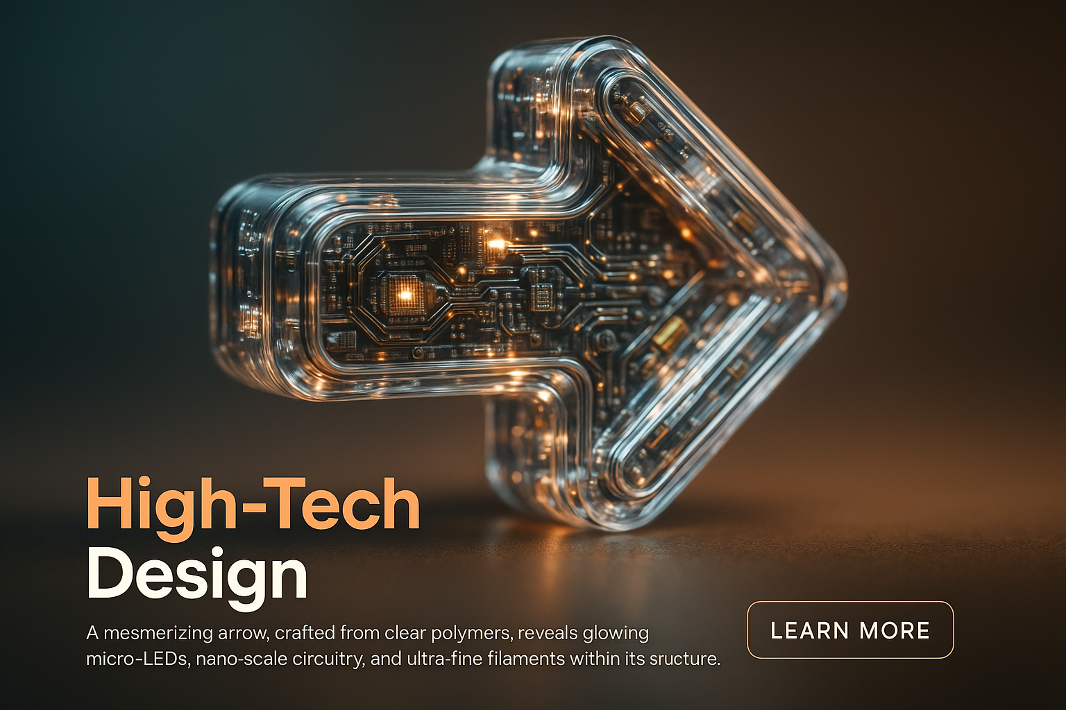 /Collection: /by davooda/Type: PNG/A close-up view of a hyperrealistic arrow, crafted from clear polymers, showcasing intricate micro-LEDs and circuit boards. The metallic components reflect ambient light, creating a stunning visual effect.
