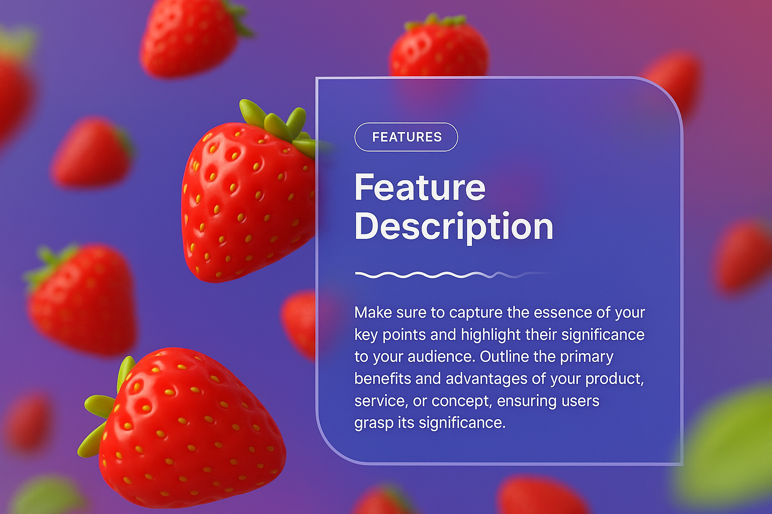 /Collection: /by davooda/Type: PNG/A vibrant illustration of falling strawberries against a smooth gradient background, featuring a text box that describes product features and highlights their significance.