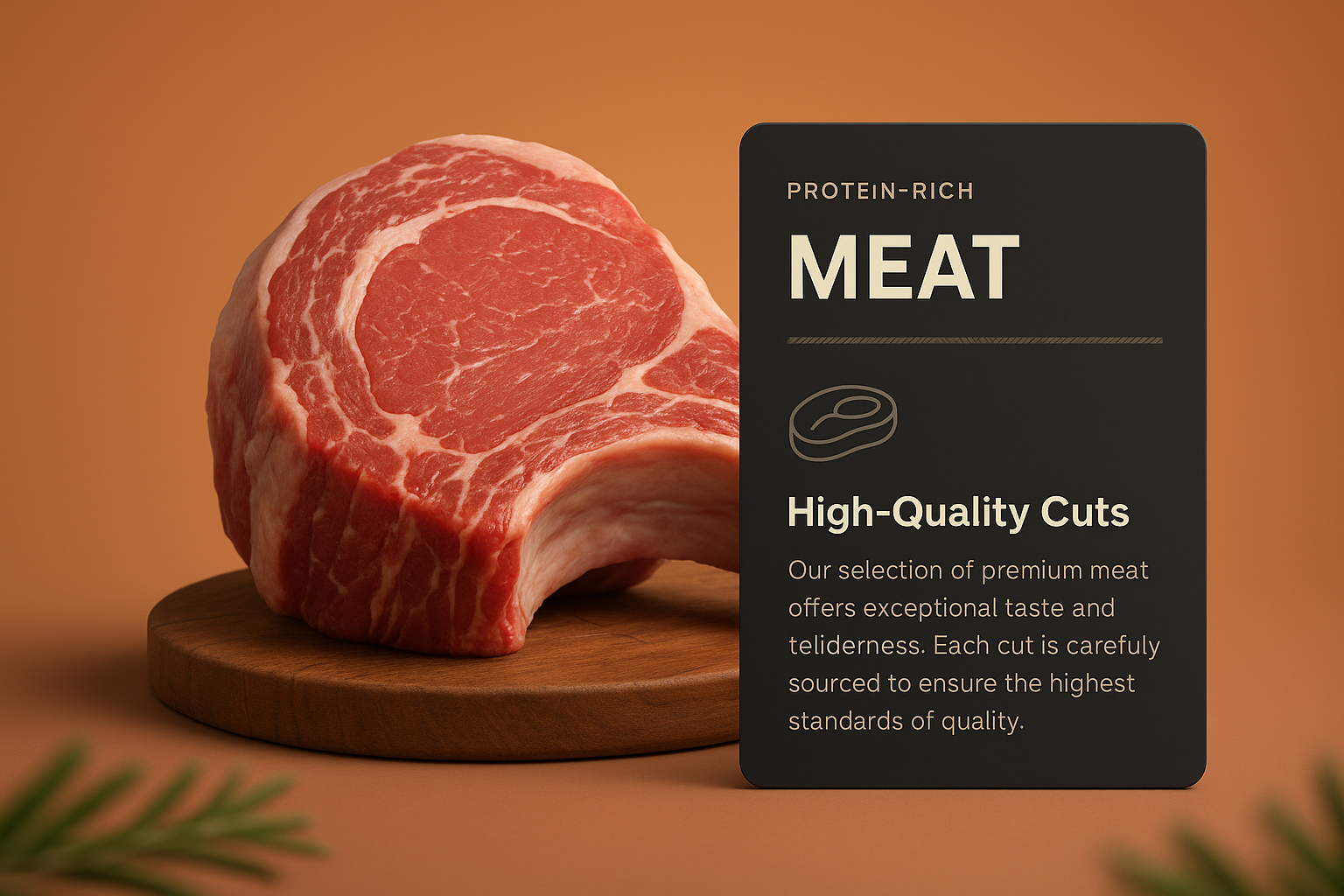 A 3D illustration of a high-quality meat cut displayed on a wooden surface, complemented by a dark label highlighting its protein-rich nature. The background features a smooth gradient.