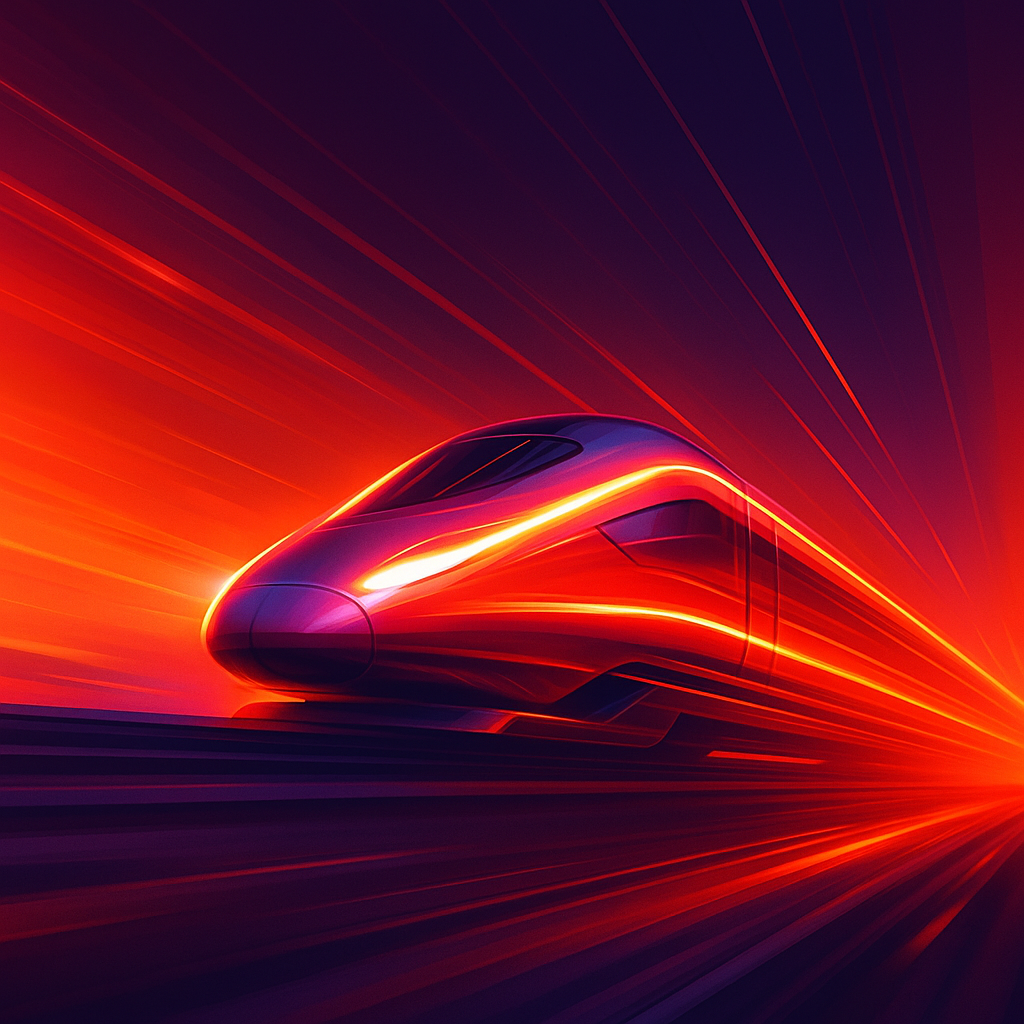 A sleek, futuristic maglev train glides through a vibrant scene filled with warm colors, featuring dynamic lines emanating from its center, creating a sense of speed and motion.