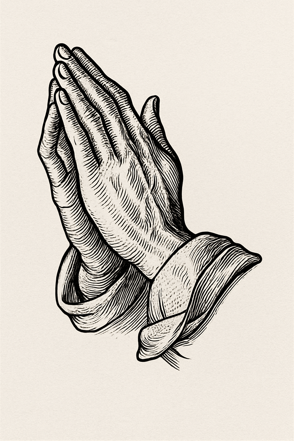 /Collection: /by davooda/Type: PNG/This image features a detailed illustration of hands in a praying position, rendered in a traditional ink style. It is suitable for religious or spiritual contexts.