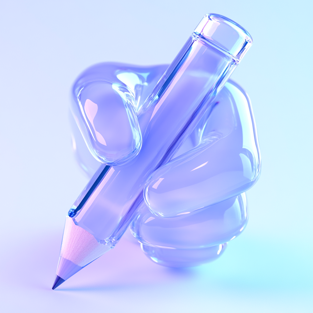 /Collection: /by davooda/Type: PNG/A visually striking 3D graphic featuring a translucent hand grasping a pencil, set against a soft gradient background. Ideal for creative projects or educational materials.