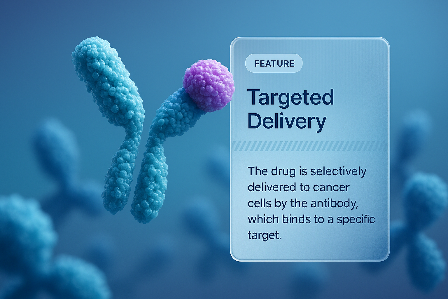 A striking 3D illustration of an antibody drug conjugate, showcasing a vibrant gradient background and detailed visual elements. The design features a highlighted 'Targeted Delivery' feature with supporting text.