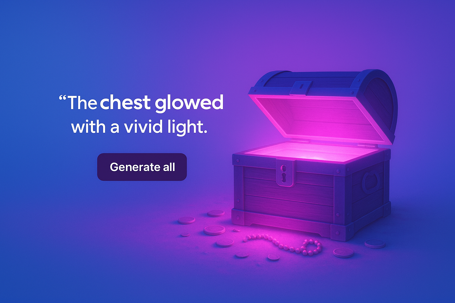/Collection: /by davooda/Type: PNG/The image features a wooden chest radiating a vivid neon-pink glow from within, illuminating surrounding coins and beads. The backdrop is a solid blue hue, enhancing the glowing effect.
