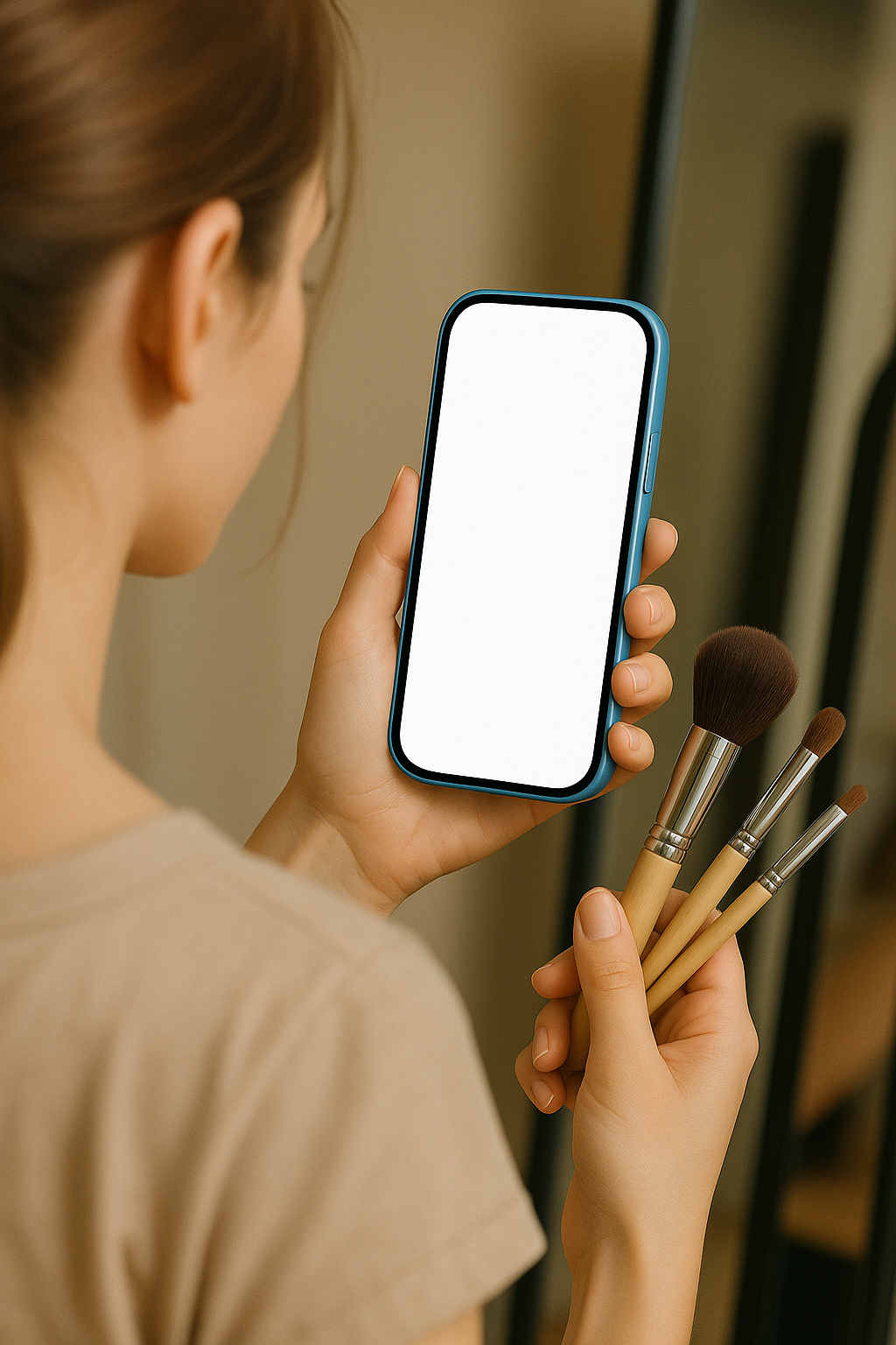 A makeup artist is holding a blue phone with a blank screen and several brushes in front of a mirror. The dynamic shot is taken from behind, focusing on the artist's hands.