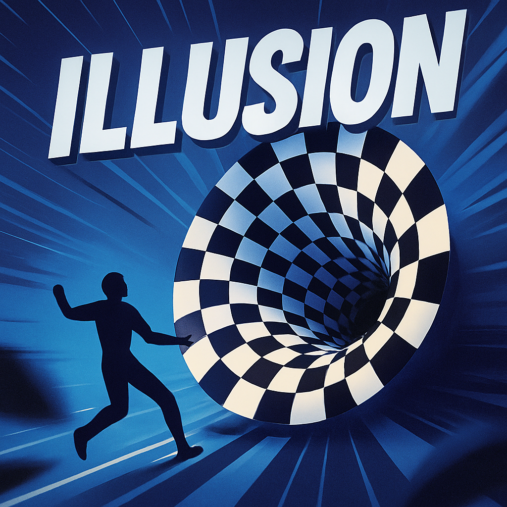 A captivating design featuring a dynamic illusion of a swirling tunnel with a silhouetted figure. The deep blue gradient background enhances the sense of movement and depth.