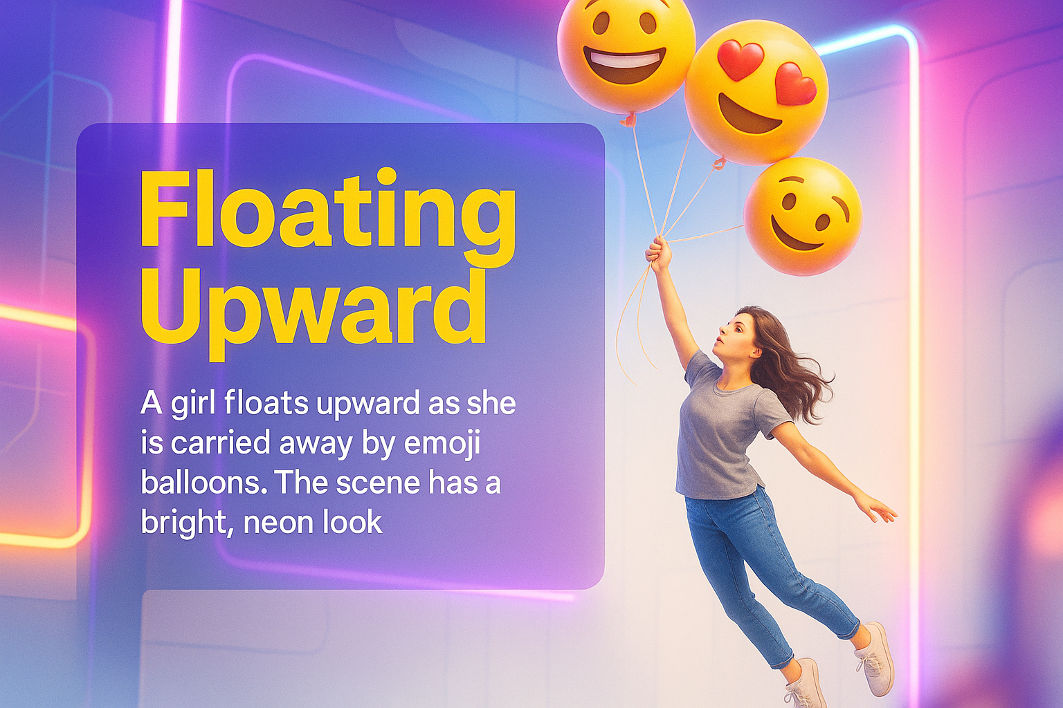Whimsical Illustration of Girl Floating with Emoji Balloons