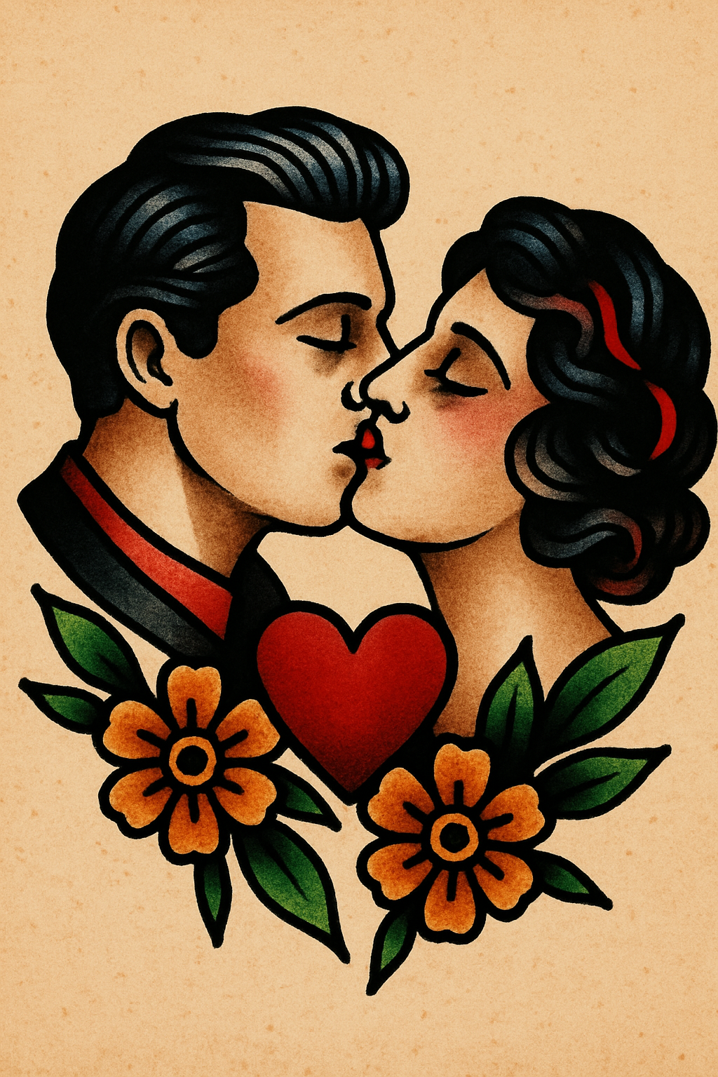 Romantic Vintage Tattoo Style Artwork of a Couple Kissing